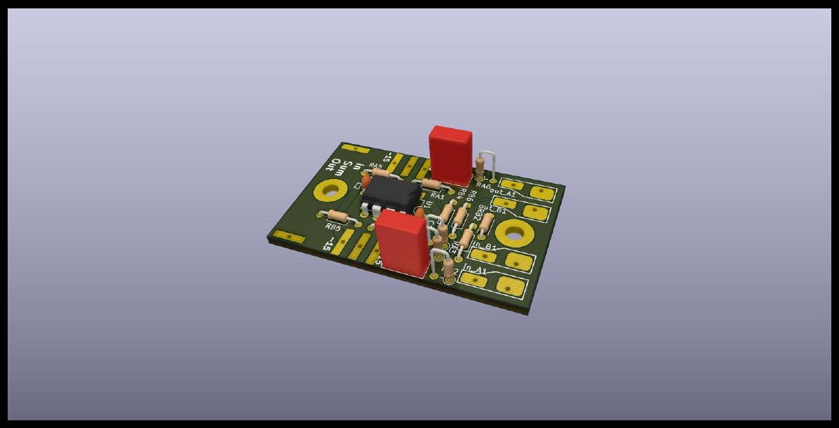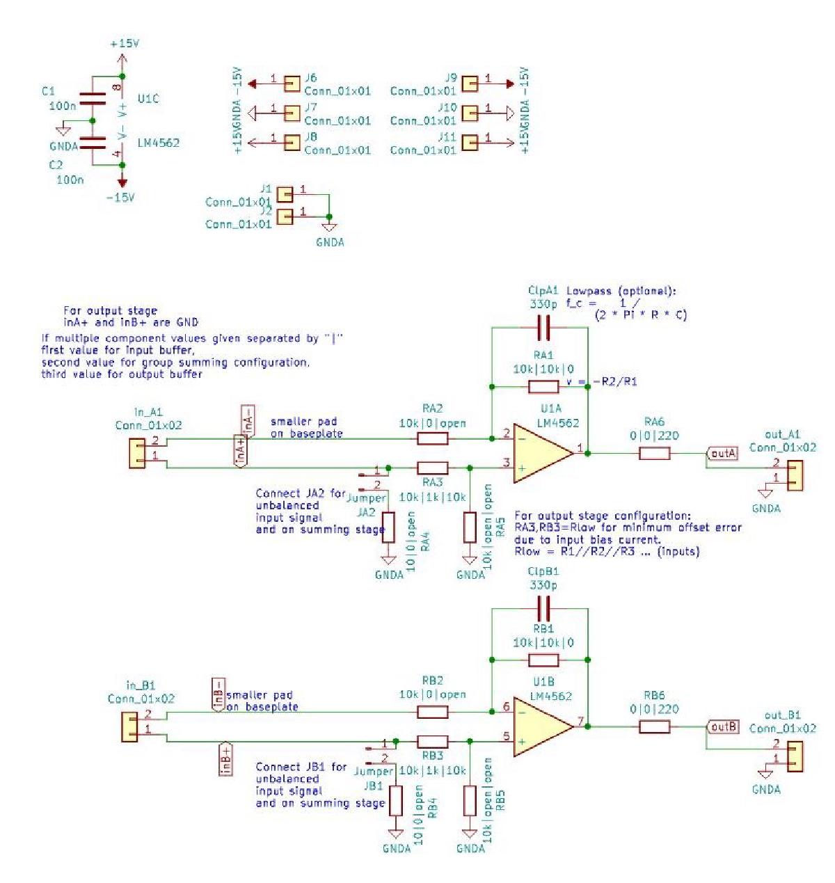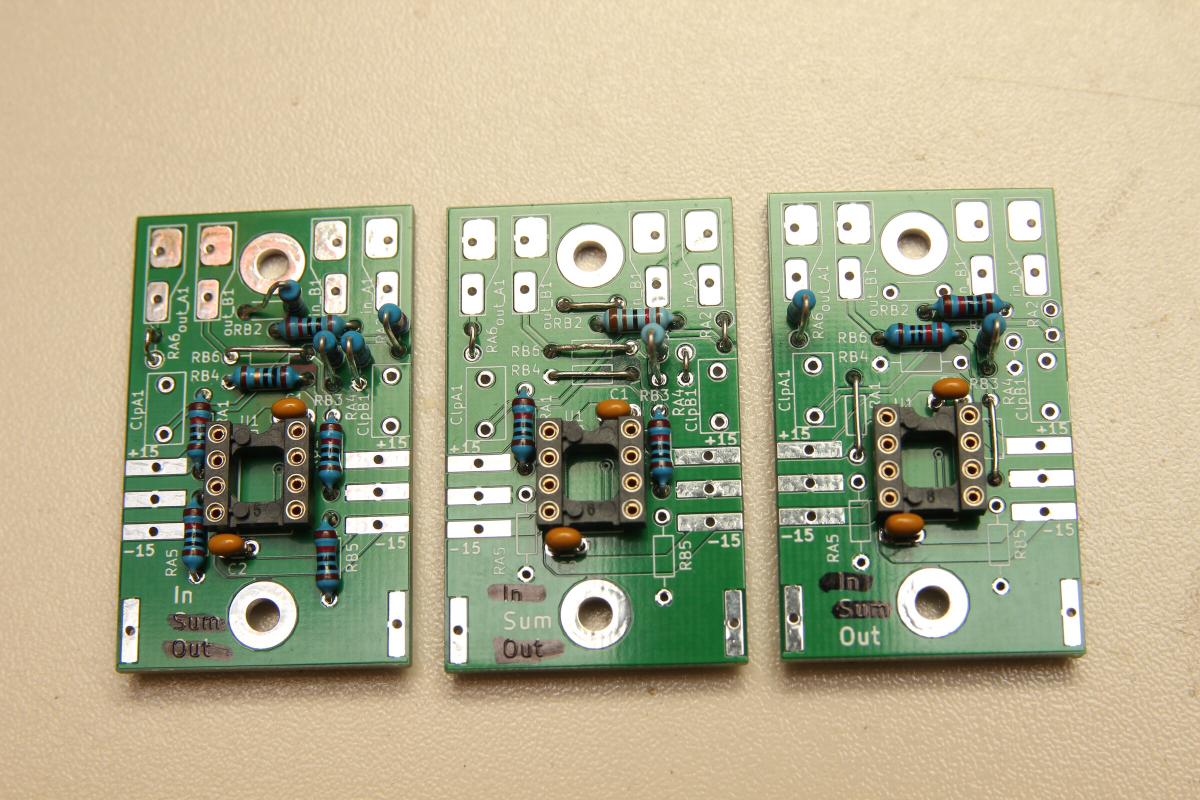 Wie eben erwähnt waren die kleinen roten Platinen nicht so dufte mit der PCI-Express Steckerlösung. Daher ein Redesign, bei dem nur der Opamp gesteckt wird. Die drei Konfigurationen Inputbuffer “In”, Summierer “Sum” und Outputbuffer “Out” werden durch die Wahl der Komponenten umgesetzt. Der größte Unterschied ist hierbei in der Art der Signalreferenz zu finden. Während der Mixer intern das Signal relativ zu GND der +-15V Spannung sieht kann das Audiosignal von außen symmetrisch anliegen, wobei der invertierende Eingang des Opamps nicht mehr GND entspricht. Dies lässt sich beispielsweise durch einlöten eines Widerstandes festlegen.