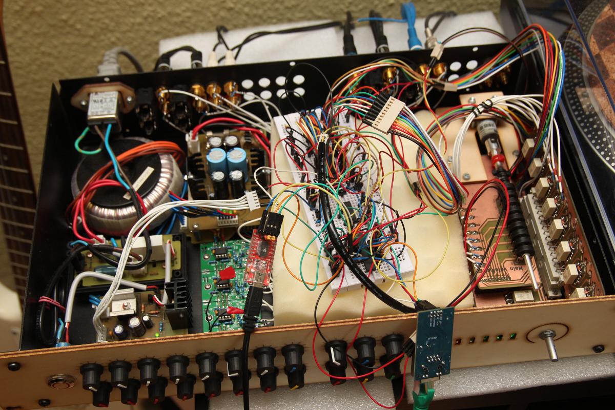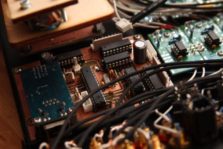 Mit ein paar dieser Opamp-boards konnte ich endlich alle Stufen des Mixers testen. Und in diesem Zustand befand sich das Projekt eine ganze Weile. Nicht weil ich keine Lust hatte, sondern weil es so bereits in meine Soundinstallation integriert war. Immerhin konnte ich auf diese Weise im Betrieb die Firmware für den Controller auf Atmega328 Basis schreiben.