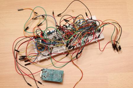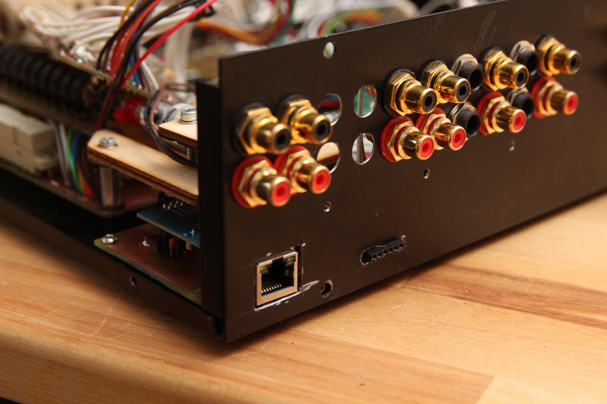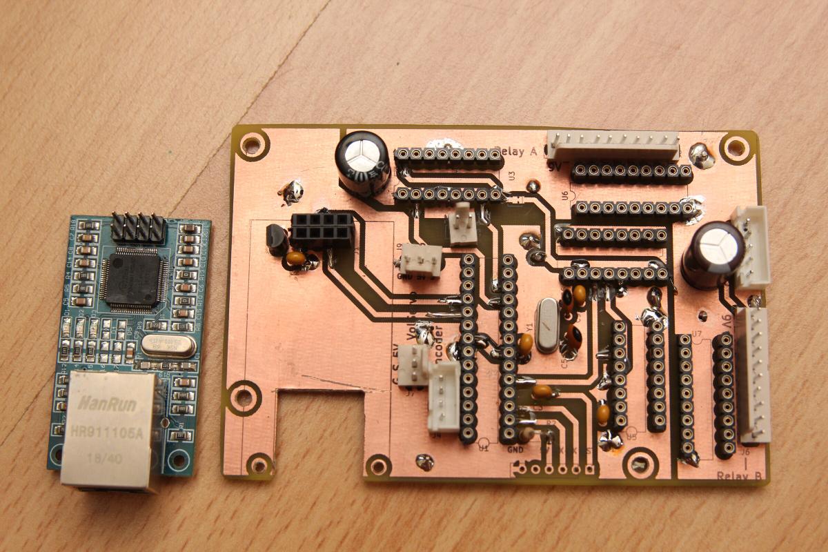 Die Netzwerkfunktion erreichte ich mit einem W5110 Ethernet Modul. Softwareseitig verwende ich eine Homie Implementation, welche mit dem TCP/IP Stack den kleinen Atmega doch recht gut füllte. Mit allem nötigen Steuerungscode für Lautstärkeservo und Relais sowie ein paar WS2812 LEDs als Statusanzeige war der Flashspeicher zu 99.8% voll. Und auch hier konnte ich wieder etwas lernen, nämlich wie Code optimiert werden kann.