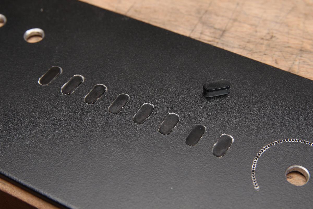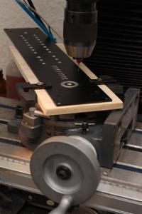 Endspurt! Die Pappelsperrholzfront wird ersetzt durch die 4mm dicke Aluplatte, die bei dem Gehäuse dabei war. Löcher für die Potentiometer zu bohren war nicht so schwierig. Langlöcher für die acht LED Anzeigen ging mit der Fräuse auch ganz OK. Aber was hab ich mir eigendlich bei dem gelöcherten Kreis um den Encoder gedacht? Wie ein paar Bilder später zu sehn scheint dort von hinten durch eine Lightpipe aus Plexiglas farbiges Licht nach vorne und zeigt Hardwareseitig die Stellung des Servopotentiometers an. Was der Lasercutter so einfach machte erforderte an der manuellen Fräse etwas Präzision. Dank eines Drehtisches musste ich nicht alle ca. 80 Positionen über das DRO anfahren. Nachdem ich die drei abgebrochenen 0,8mm Bohrer auch wieder aus den Löchern geholt hatte war die Front fertig.