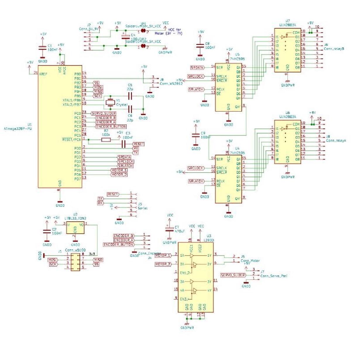 Als Motortreiber kommt ein L293D zum Einsatz. 74HC595 Schieberegister dienen als Portextender und Schalten mittels ULN2803 die Relais. W5100 Ethernet Modul hab ich ja bereits geschrieben. Viel mehr ist das auch nicht.