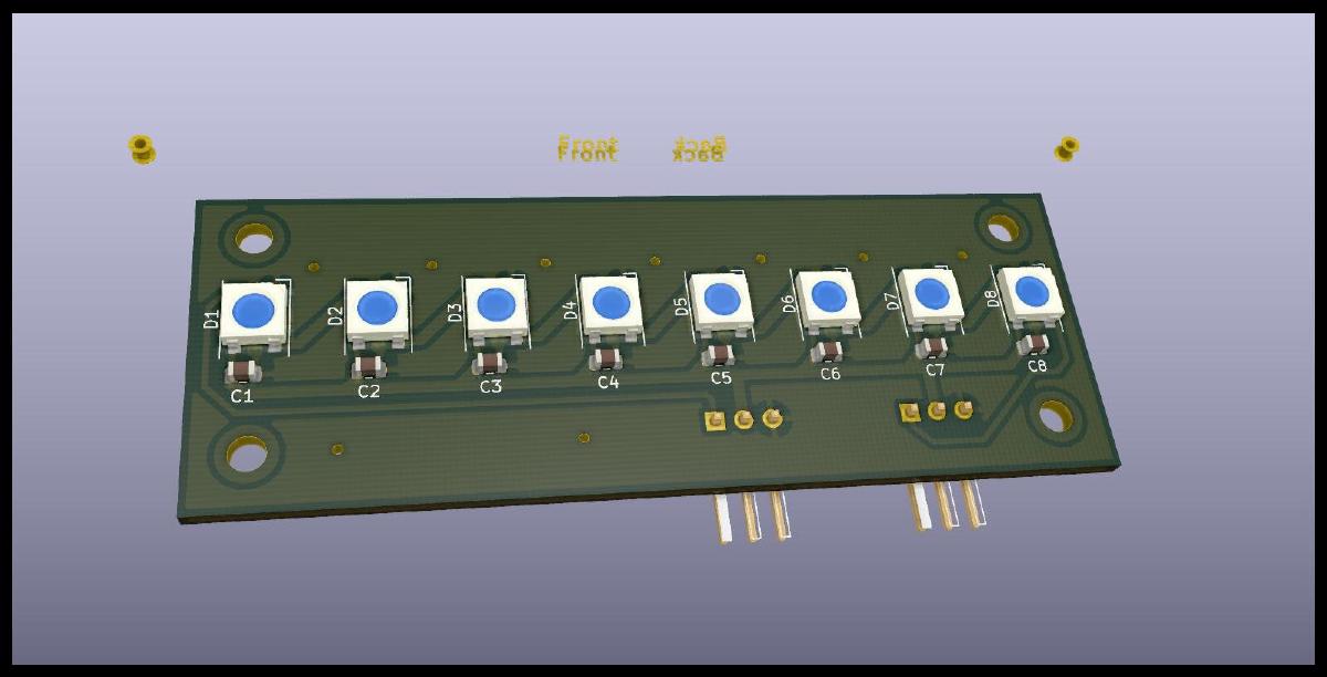 Die WS2812 LED’s habe ich extra auf eine eigene Platine umgelötet. Diese wird mit etwas Abstand hinter die Frontplatte montiert. Vier Distanzschrauben habe ich dafür mit Epoxydkleber auf das Aluminium geklebt.