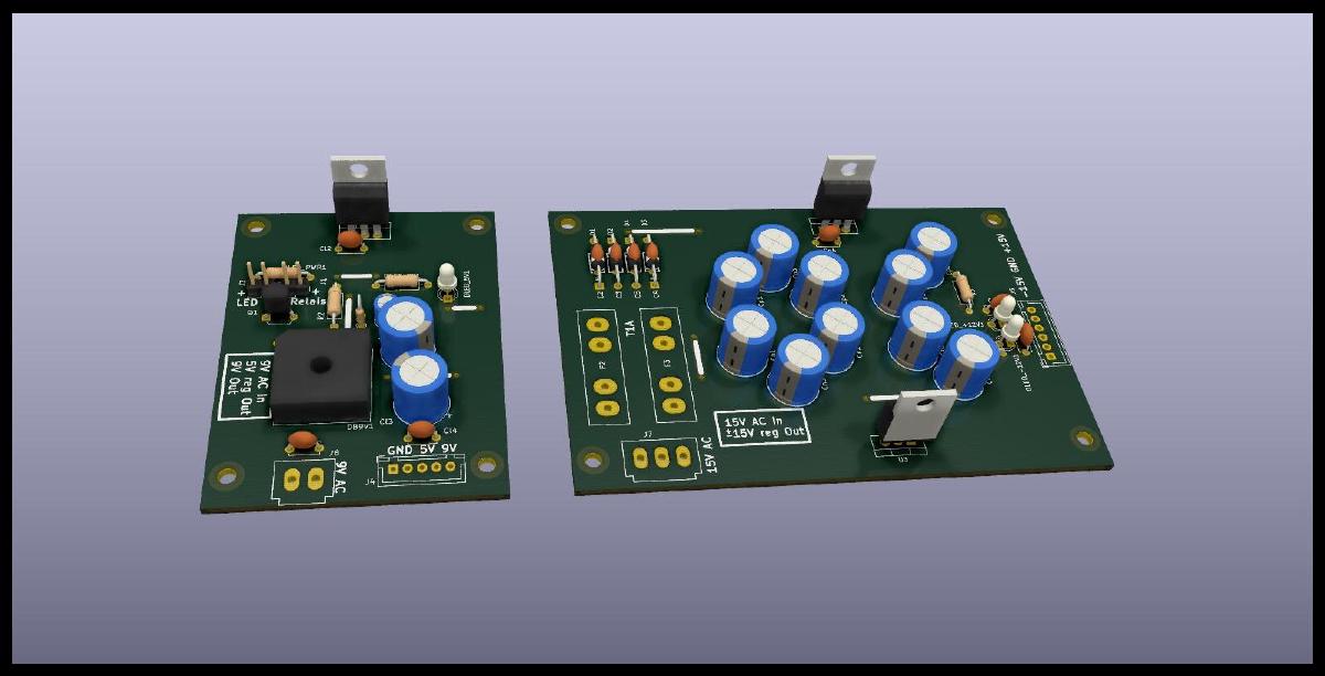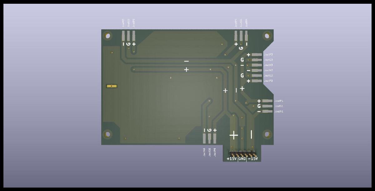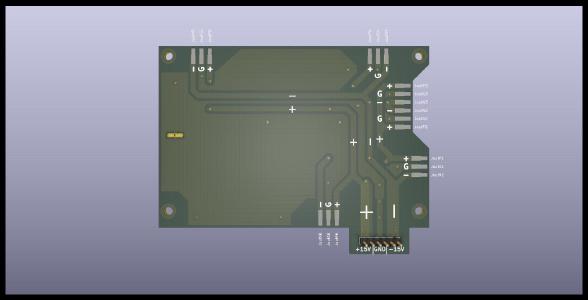 Und nochmal zurück zu unserem Freund der Spannungsversorgung. Weil mal wieder alles fancyer wird als nötig bekamt die +-15V Platine noch eine Verteilung untendrunter. Von dort wurden die Opamp Platinen auf kürzestem Weg angelötet und von dort aus Daisychained.