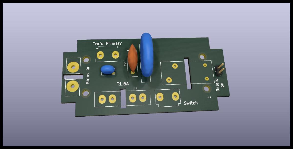 Das schwarze Bauteil neben dem Blauen MOV ist ein 33 Ohm 3,1 W NTC, der den Einschaltstrom begrenzt. Etwa eine Sekunde später wird über die 5V Spannung eine Relais geschaltet und überbrückt den NTC.