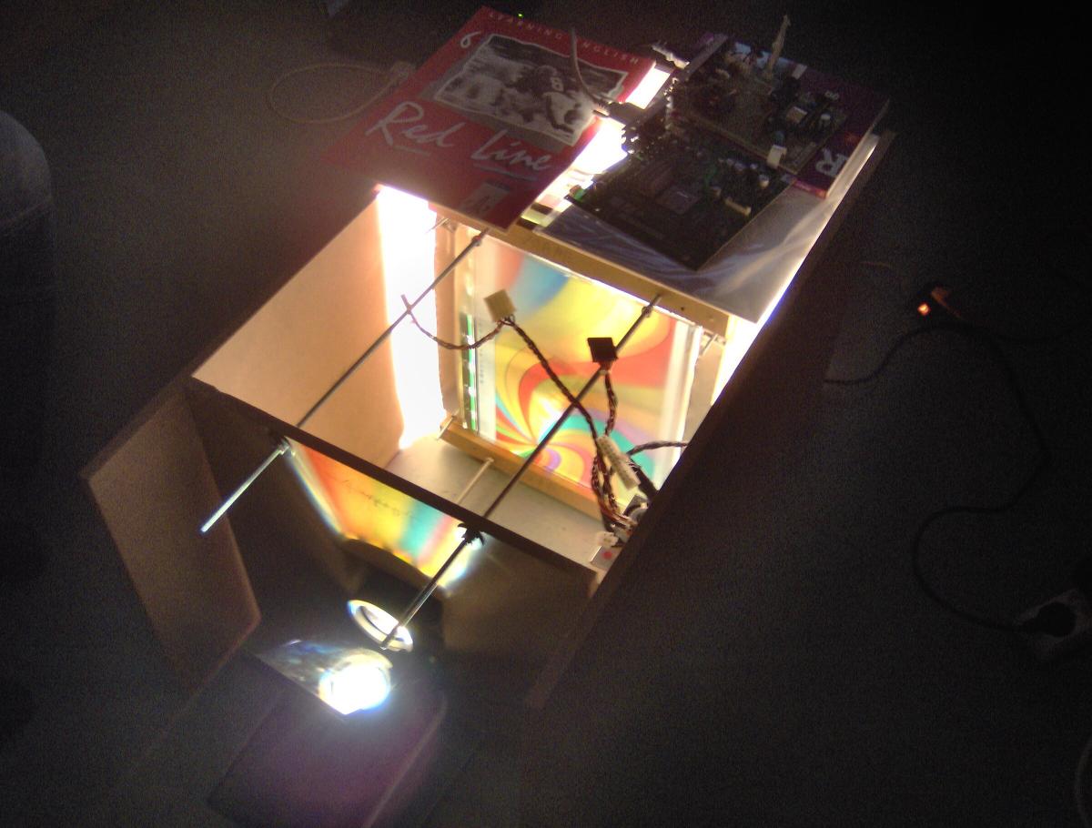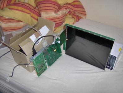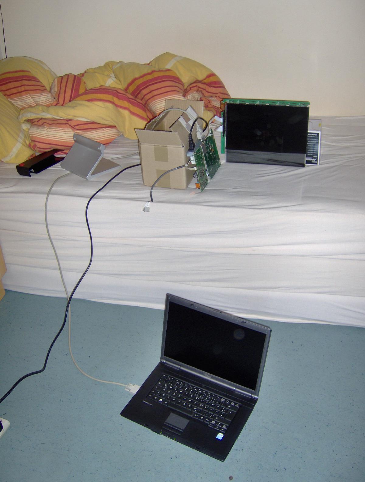 Nachdem ich das TFT Zerlegt hab musste ich noch prüfen, ob es auch noch funktioniert. Da es prima funktionierte hab ich es auch gleich mal provisorisch zwischen die Fresnels gelegt und alles irgendwie an die Steckdose geklemmt. Die Resultate wahren mehr als zufriedenstellend.