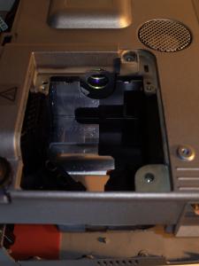 Also Beamer wieder zusammengeschraubt, eine Taschenlampe in dem Lampenschacht gehalten und durch das objektiv in dem Beamer geguckt.