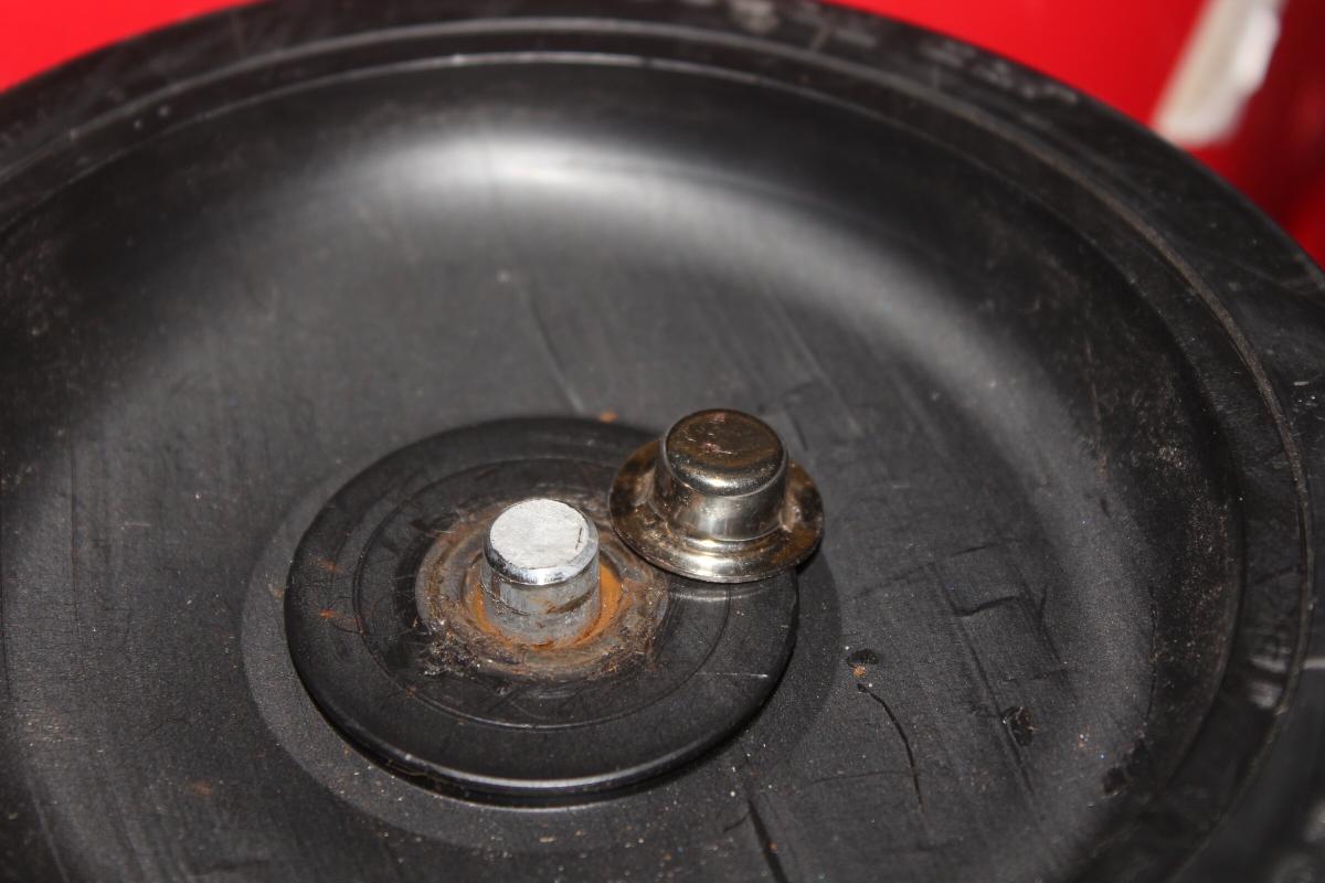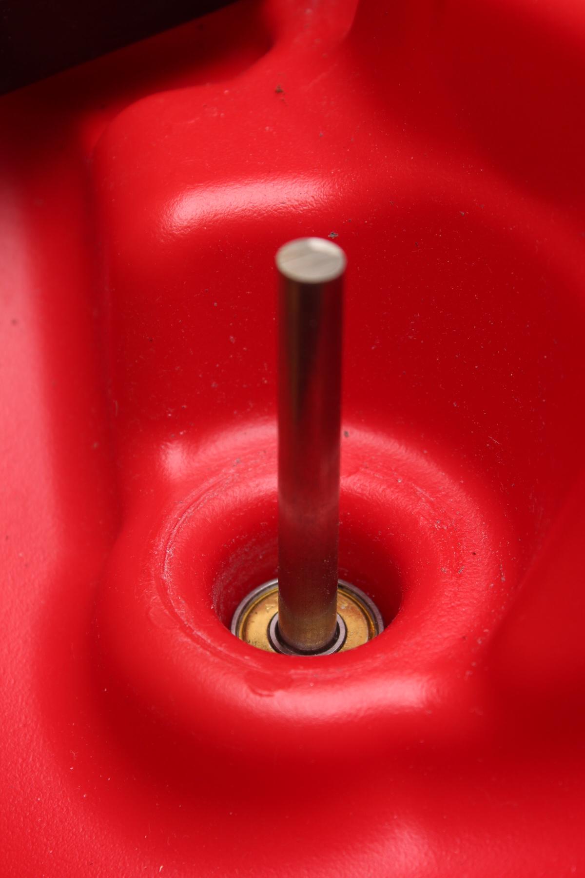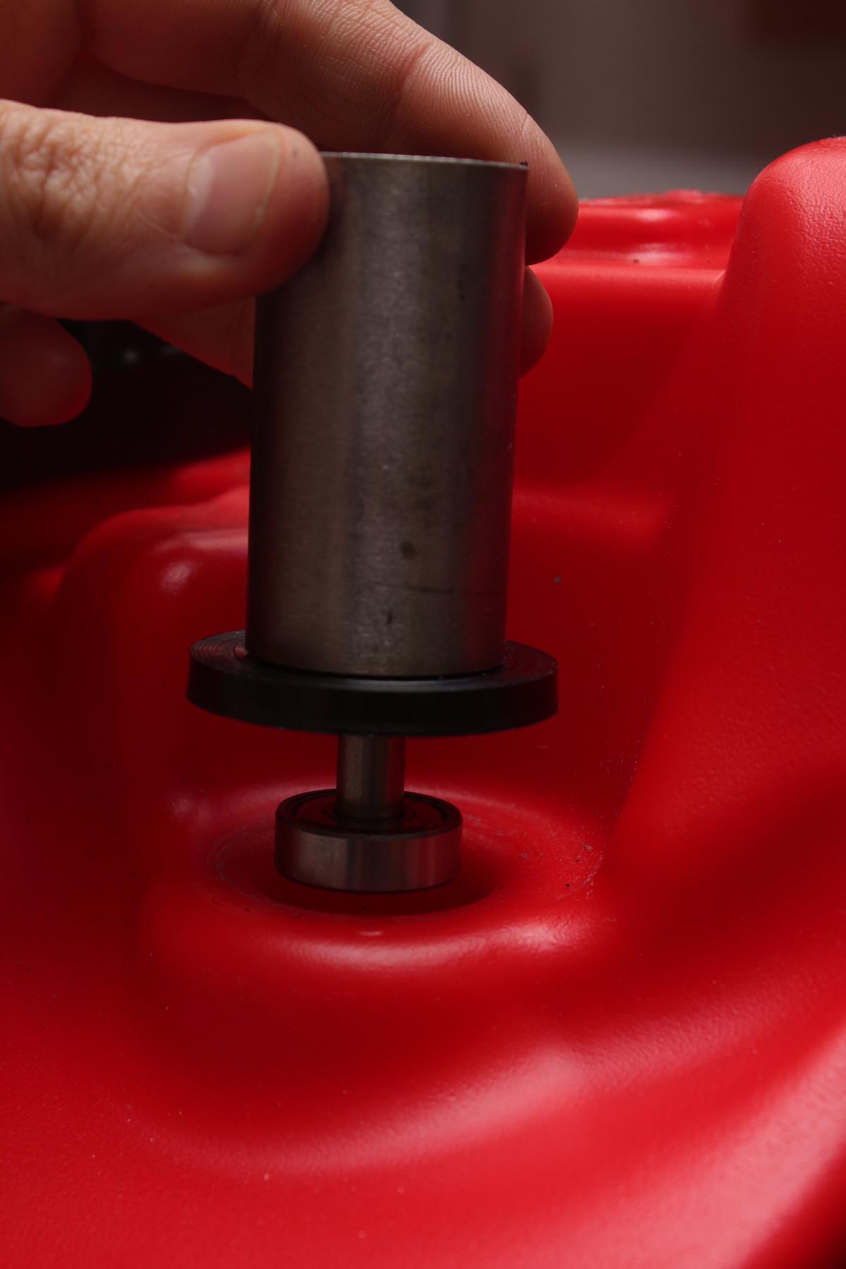 Auf der Plastikscheibe (42mm Durchmesser, 5mm Dicke) sitzt ein Edelstahlrohr. In dem Rohr ist eine 8mm Stange eingesetzt, welche durch genannte Plastikschreibe und einen weiteren Zylinder mit Loch im Inneren mittig gehalten wird. Durch eine Feder um die Stange wird das Kugellager in seinen Platz gedrückt.