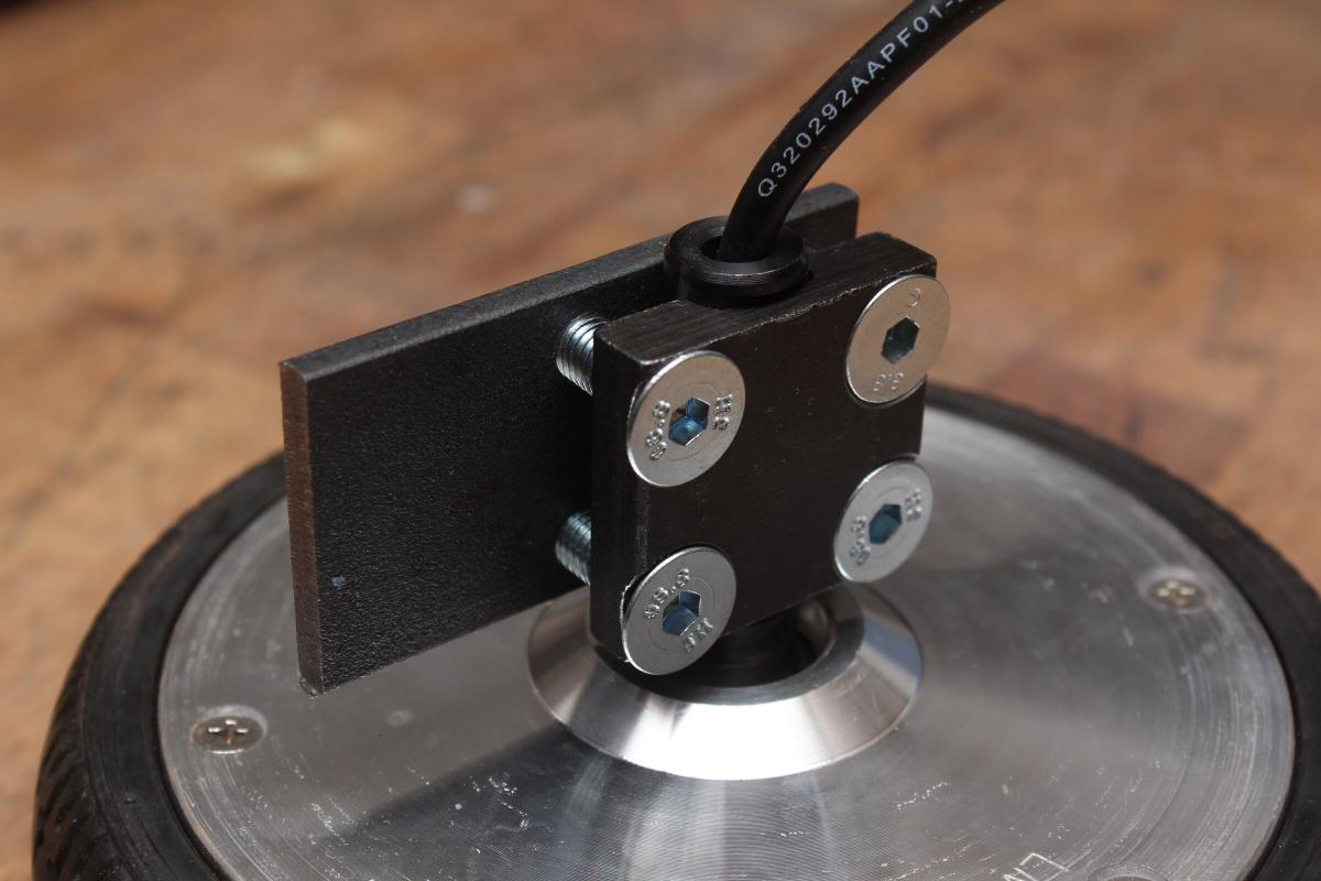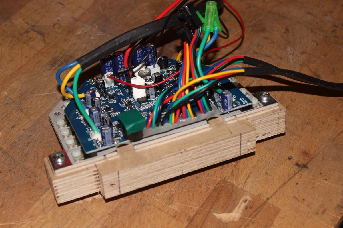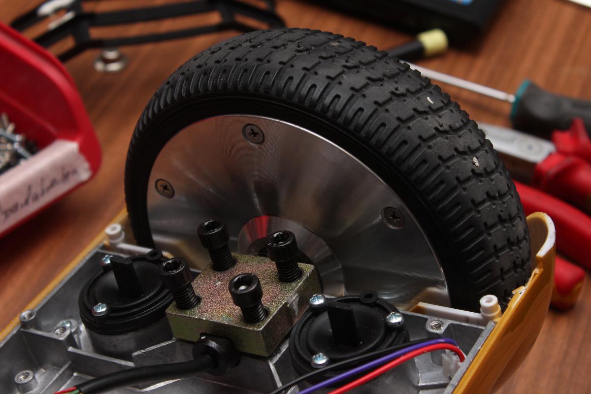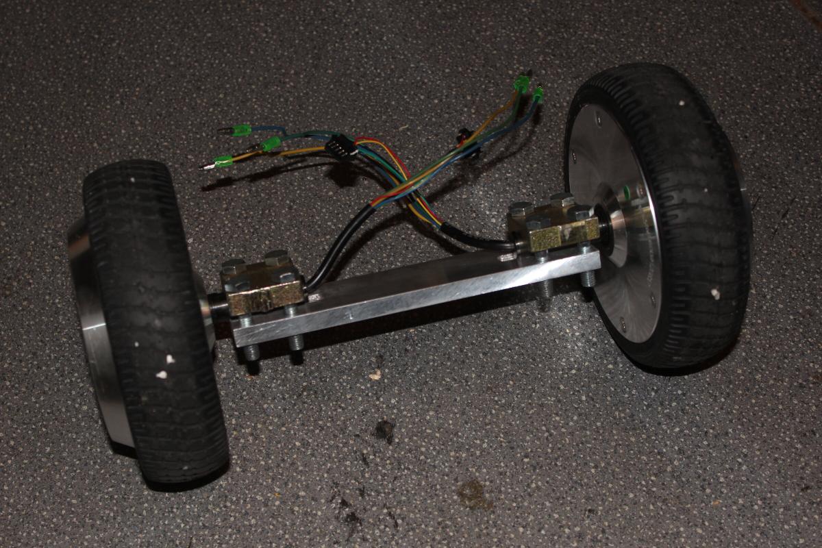 Kurzer Exkurs, für die jenigen, die son Teil noch nicht von innen gesehn haben: Außen befinden sich die Reifen. Der Motor ist ein Brushless Außenläfter. Motorkabel und die der Hallsensoren sind durch die Welle herausgeführt. Die Welle hat eine Kerbe und wird durch eine Metallplatte mit vier Gewindeschrauben am Gußaluminium festgeschraubt. Auf der im Bild rechten Seite befindet sich das Mainboard, welches einen STM32F103 verwendet, um zwei Brushless Controller zu implementieren. An der gleichen Stelle auf der anderen Seite sitzt der 10S2P LiIon Akku mit eingebautem BMS. Die beiden gleichartigen Platinen neben den Motoren steuern das Hoverboard durch je eine IMU, jede Seite balanciert sich demnach unabhängig voneinander. Die Laderegelung (CC/CV) befindet sich nicht im Hoverboard sondern in den beiliegenden Netzteilen. Besteigt man das Hoverboard werden auf jeder Seite mindestens einer der Gumminippel eingedrückt, wodurch eine Lichtschranke das Board aktiviert. Ganz einfach also.