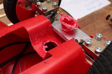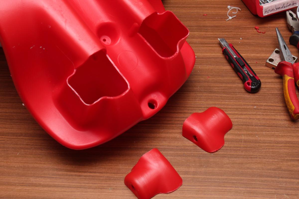 Das bisschen Plastik wird nie im Leben die Kraft der Motoren aushalten. Abgesehen davon besteht keine Möglichkeit die Welle zu befestigen. Daher hab ich die zwei Ecken mit einem Teppichmesser herausgeschnitten.
