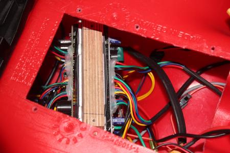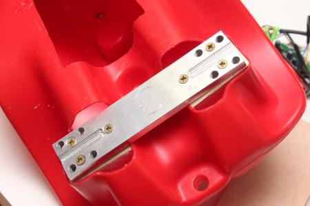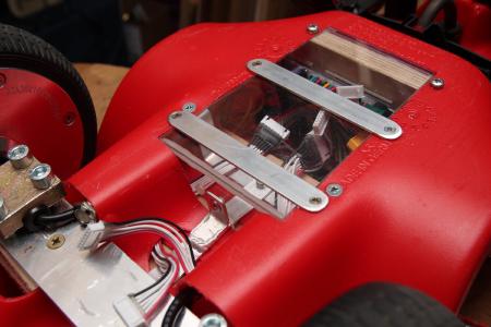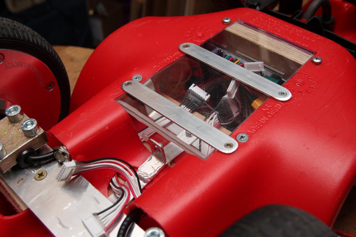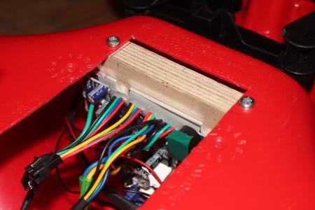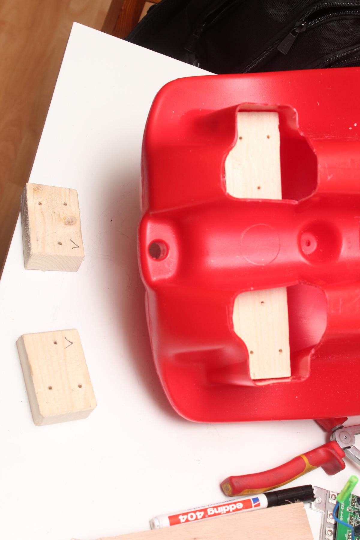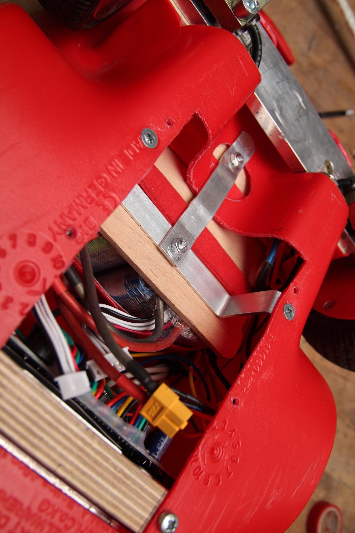 Etwas länger hab ich mir den Kopf zerbrochen, wie die beiden Klumpen in den Rumpf des Bobbycars passen. Zuerst musste das nach innen ragende Plastikteil weichen. An einer Holzplatte wurden die Akkus mit selbstverständlich rotem Klettband fixiert und diese mit Aluprofilen am Plastik angeschraubt.