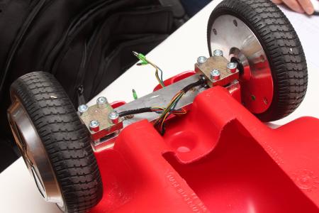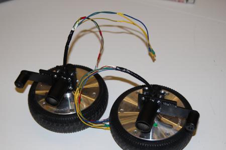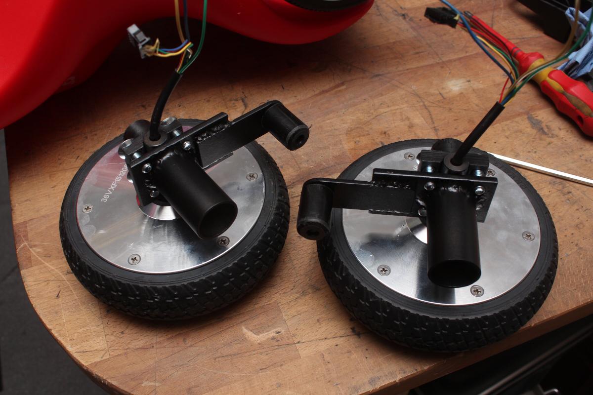 Als Vorderräder sind die Hoverboardreifen ebenfalls gut geeignet. Allein schon aus dem Grund, dass sie Kugelgelagert und aus Gummi sind. Netter Nebeneffekt, sie haben nen Motor. Den dann noch mit anzuschließen ist dann auch kein Aufwand mehr; Allrad yay \o/