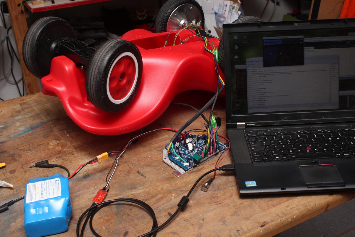 Für die Kabel der vorderen Motoren hab ich seitlich in das Bobby Car Löcher gebohrt, sodass die Kabel auf kürzestem Weg in das Innere gelangen. An den Holzblock wurde dann das zweite Hoverboardmainboard geschraubt und programmiert. Mit einem Y-Stecker ist der Akku mit beiden Platinen verbunden. Die Masse und das Signal vom Gaspoti hab ich zudem einfach an beide Platinen angeschlossen, die 3V3 bekommt das Poti jedoch nur von einem Controller.