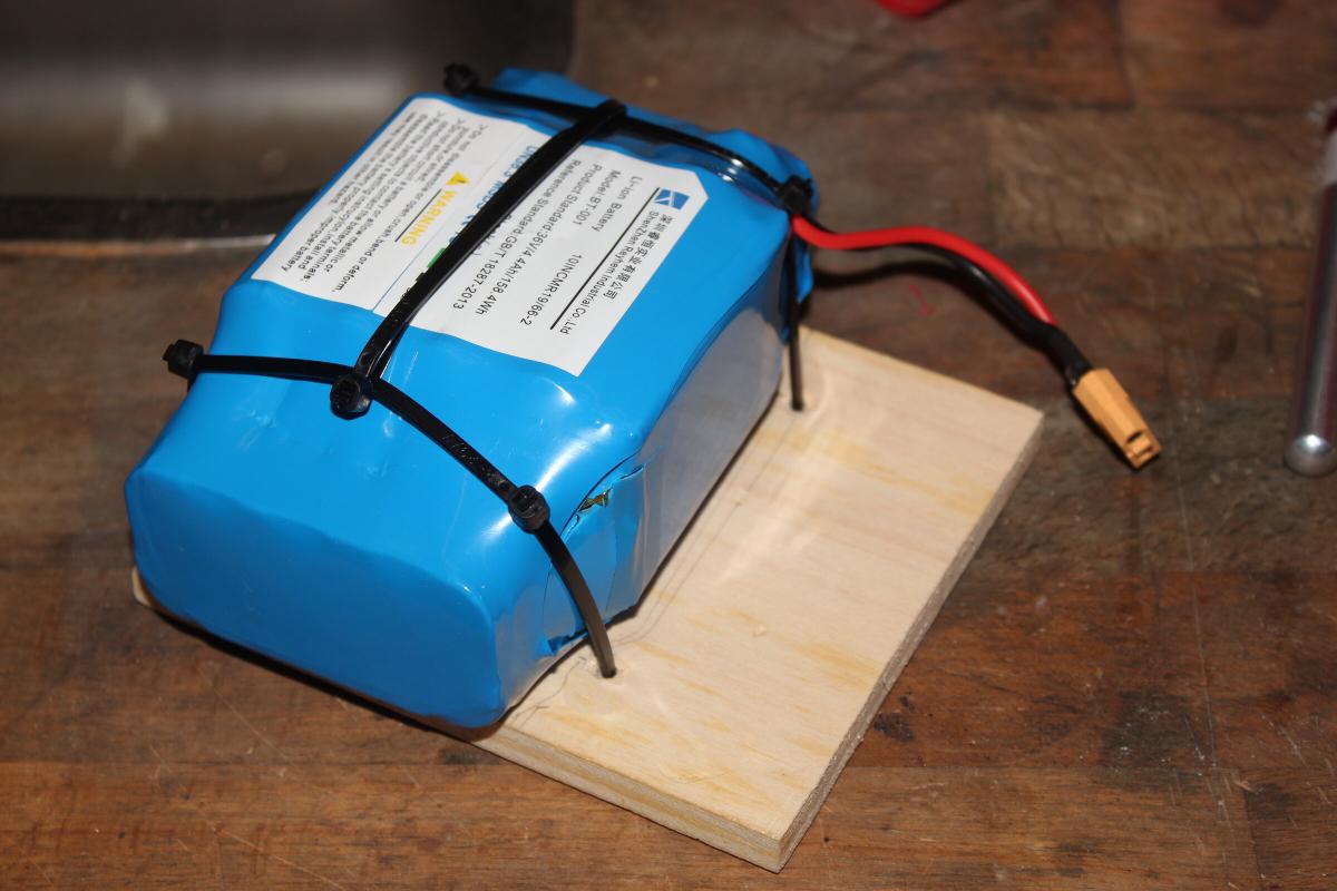 Der Akkublock wird mit Kabelbindern an einer Holzplatte befestigt. Diese verschließt dann von innen die Öffnung unten.