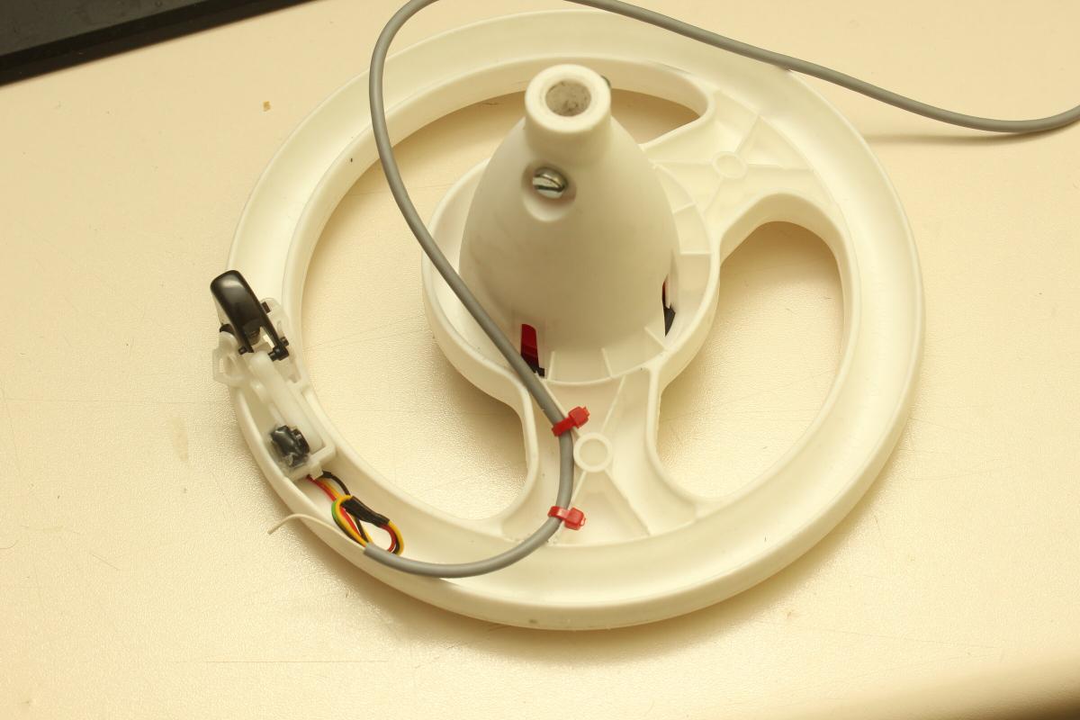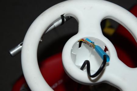 Zudem musste ich zur Filterung einen 2.2µF Kondensator zwischen Masse und Signal löten, da das Signal so verrrauscht war, dass das Bobbycar ruckartig von selbst losfahren wollte. Ein 100nF Kondensator zwischen GND und 3.3V kurz vor dem Hallsensor half auch etwas, die Versorgungsspannung zu glätten. Beides nicht die Musterlösung, tut aber. Die kleine Platine konnte dann mit den Kabeln unter der Hupe verstaut werden.