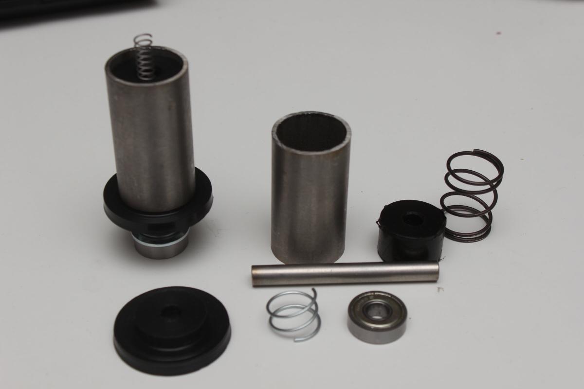 Dann zusammenschrauben und die restlichen Teile, wie Stahlstange, POM-Teile, Federn und das Kugellager einsetzen.