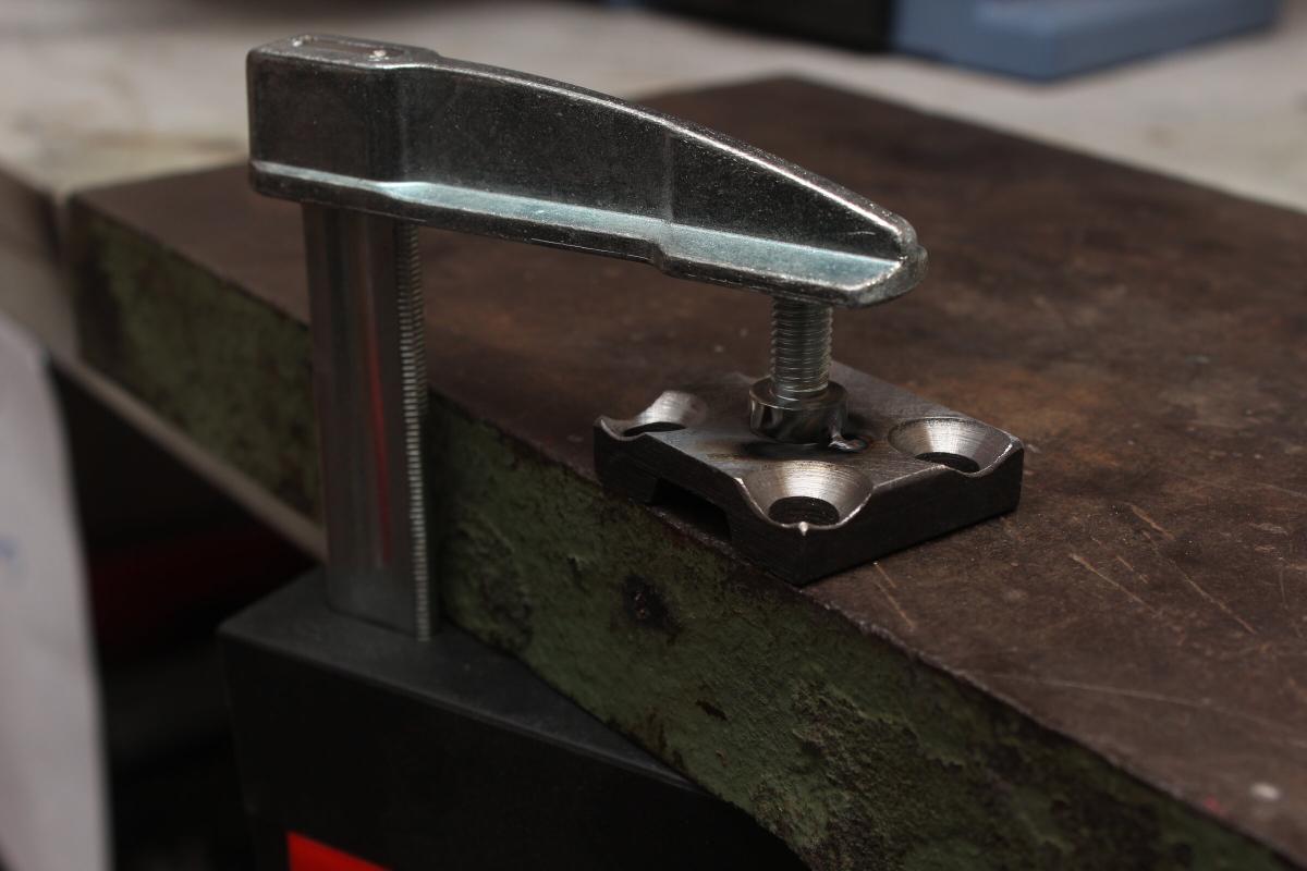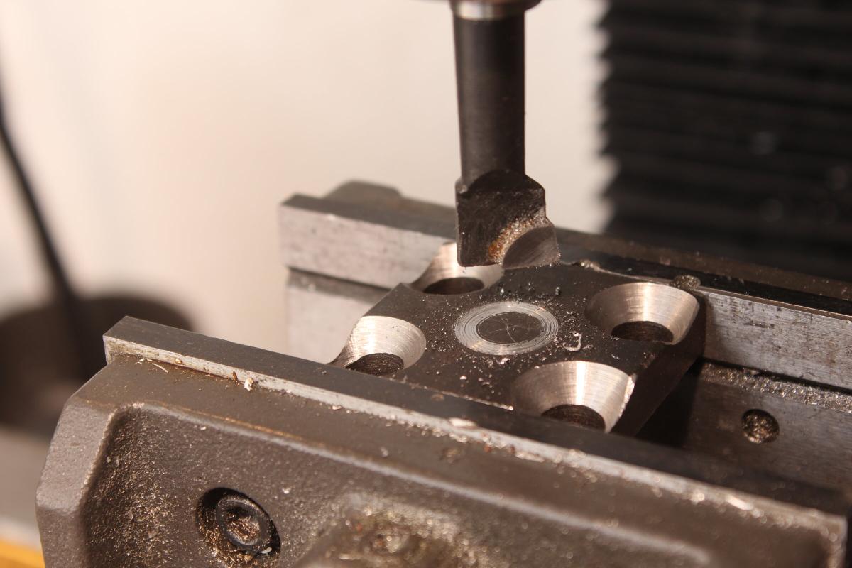 Was also noch fehlt ist das Gegenstück. Zuerst musste ich den Mittelpunkt der Spannplatte finden. Dazu hab ich die Senkkopfschrauben eingeschraubt und mit einem Messschieber den Mittelpunkt ermittelt. Nachdem das Bauteil in der Fräse eingespannt und zentriert war, konnte ich einen Kreis in die Oberfläche “kratzen”. Mit dieser visuellen Ausrichtungshilfe liess sich jetzt eine zuvor angeschliffene Schraube platzieren und festspannen.