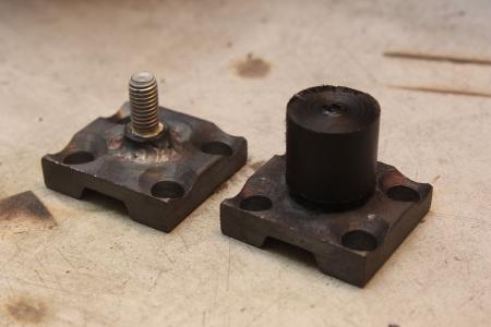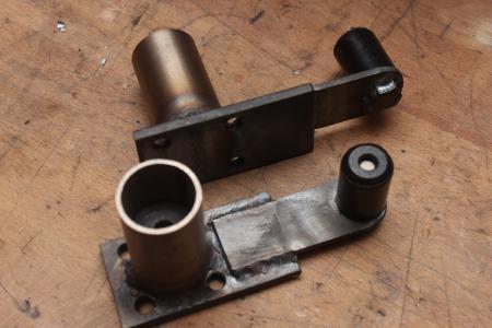 Jetzt fehlte noch der der Lenkhebel als Verbindung zur Spurstange. Dazu wird je Seite eine Schraube mit einer Stahlplatte verschweißt, auf die dann ein passend gedrehtes Stück POM als Gleitlager aufgeschraubt wird. Die Längen hab ich direkt am Bobbycar abgenommen.