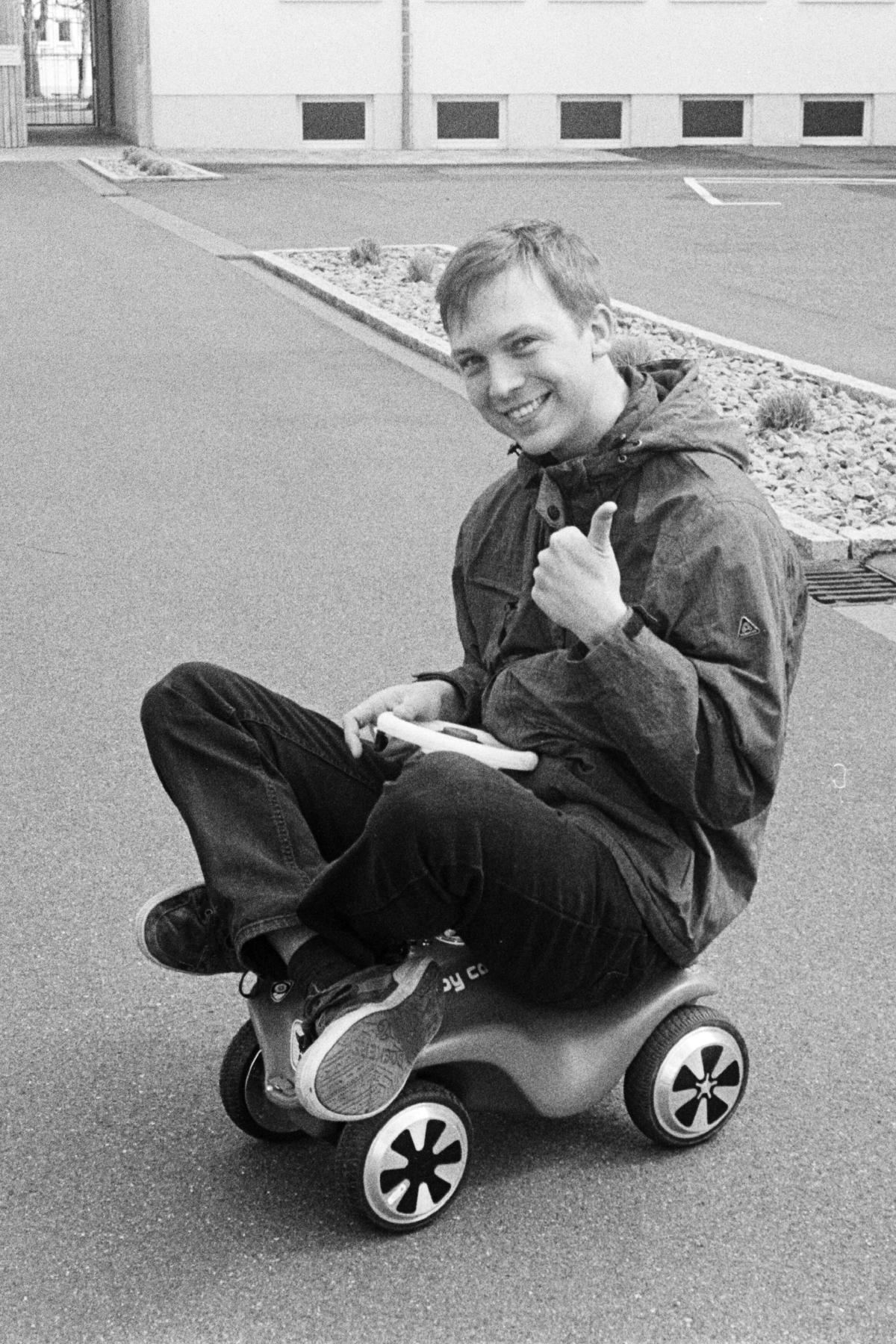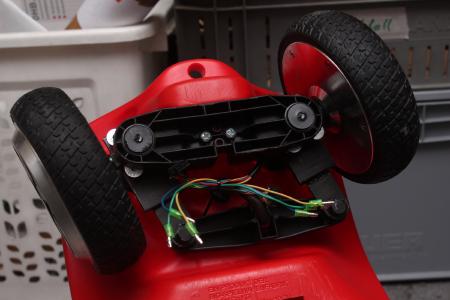 Bei den Hoverboards/Balance Scooter sind die Motoren in den Rädern verbaut. Dadurch ist keine komplizierte Mechanik nötig, um was Fahrendes zu bauen. Als ich dann so ein ausgeschlachtetes Rad in der Hand hielt fiel mir direkt ein Bobbycar ein. “Ob das nicht einfach direkt untendrunter passt?”, fragte ich mich. Es passte! Sonst würd ich das jetzt nicht schreiben.