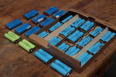 Um mit etwas Plan an die Sache zu gehen hab ich die 54 Zellen, die ich als Zweierverbund gelassen hab, erst auf 4.1V geladen und dann zuerst mit 2A, danach mit 0.5A entladen und die Kapazitäten, zusammen mit dem gemessenen Innenwiderstand auf den Akkus notiert.