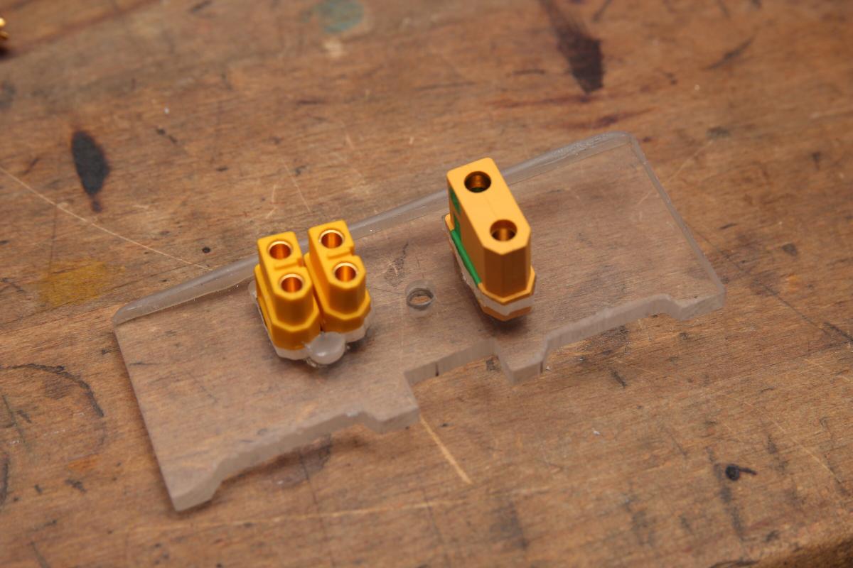 Irgendetwas, um die Akkus einerseits getrennt voneinander zu laden und auch die Stromversorung komplett zu unterbrechen, wollte ich noch anbringen. Dazu bekam die gerade erwähnte dicke Acrylglasplatte ein paar ausfräsungen für zwei XT60 und eine XT90 Antisparkt Buchse.