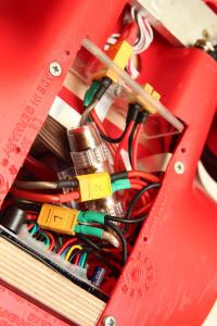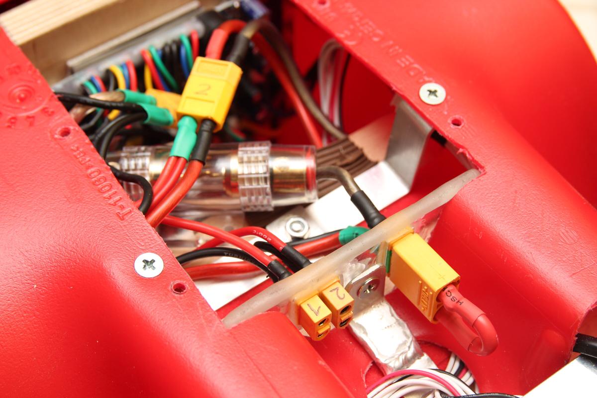 Die beiden XT60 sind direkt mit den Akkus verbunden. Der XT90 Antisprak, an welchen ein Stecker als Brücke kommt, verbindet beide 6S Akkus in Reihe. Dazu noch eine AGU Sicherung und alles ist tip top. Bisher hatte ich einen Peak von 40A messen können, daher sollte eine 40A Sicherung erstmal reichen.