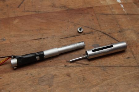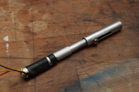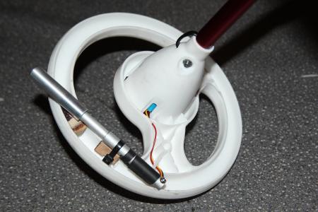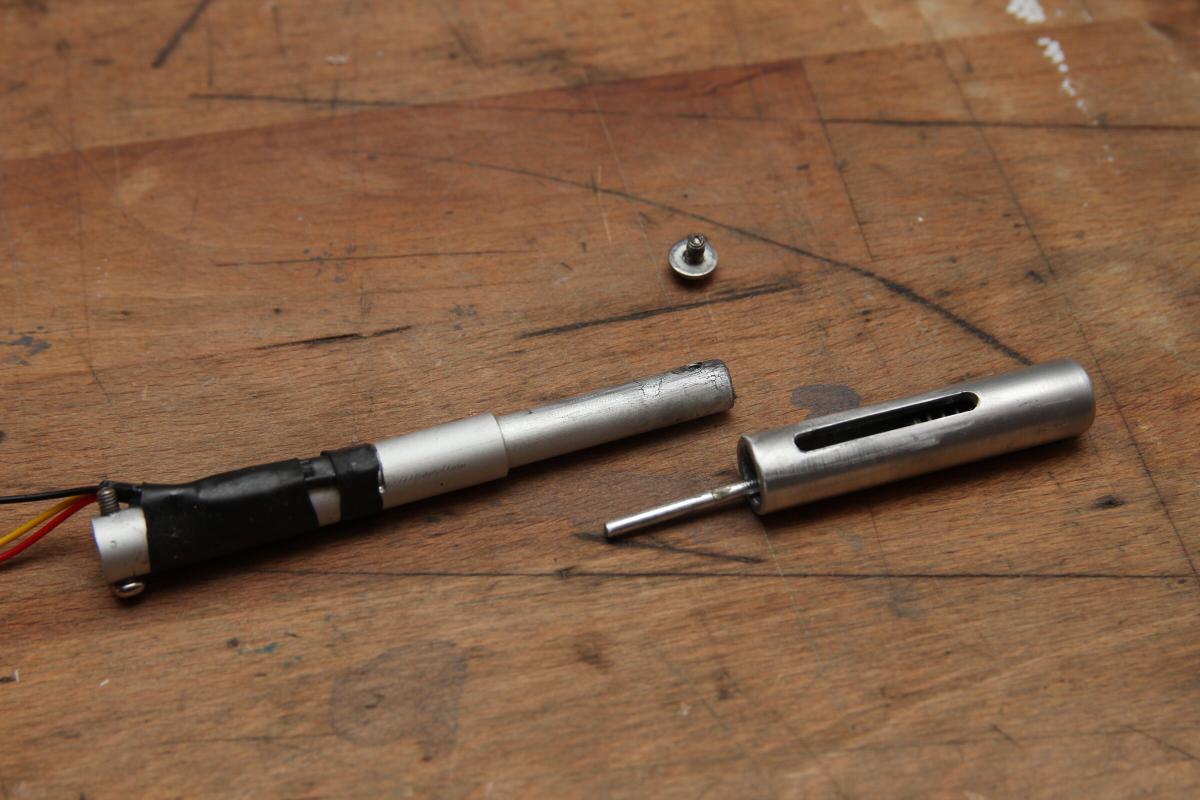 Statt einem Poti wird hier ein ca 2cm langer Stabmagnet an einem Hallsensor vorbeigeschoben, der dann eine analoge Spannung je nach Magnetfeld ausgibt. In den Alrohren befindet sich der Magnet mit einer Feder am unteren Ende. Von vorne drückt der äußere Aufsatz durch eine Stange den Magnet nach hinten. Der Hallsensor befindet sich aussen am Alurohr und wird durch Schrumpfschlauch und etwas Epoxy gehalten.