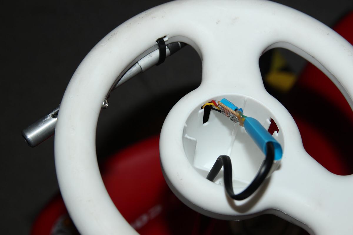 Die Gelegenheit hab ich genutzt ein neues Kabel vom Lenkrad zum Controller zu ziehen. Diesmal ist es etwas flacher und kann dadurch zwischen Lenkstange und dem Eloxierten Alurohr geführt werden. Zuerst wollte ich den Gasgriff in Form des Lenkrads gebogen bauen, das wurde aber nix. Daher ragt der vordere Teil nun etwas weit heraus. Unten fixiert ein Kabelbinder den festen Teil des Rohrs. Oben hab ich die Schraube, die durch den Schlitz im beweglichen Teil geht durch eine Längere ersetzt, welche durch einen Holzblock geht, der von unten in das Lenkrad passt. Mit ein paar Unterlegscheiben passt der Abstand zum Plastik dann auch, sodass nichts schleift oder klemmt.