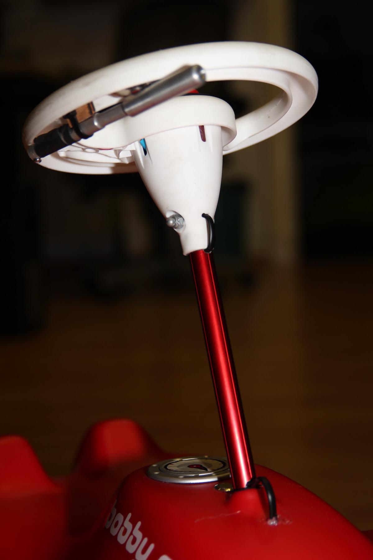 Das zuvor erwähnte Plastikteil, was die gesamte Lenkung zusammenhällt, sitzt auf dem oberen (Bobby Car liegt auf dem Rücken) Ende der Lenkachse.
