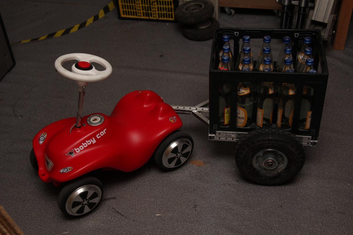 Danach hab ich einen kleinen Anhänger gebaut, welcher Bierkästen mit einem Standartmaß von 400x300 wunderbar ziehen kann. Doku hier: Bobbycar Anhänger