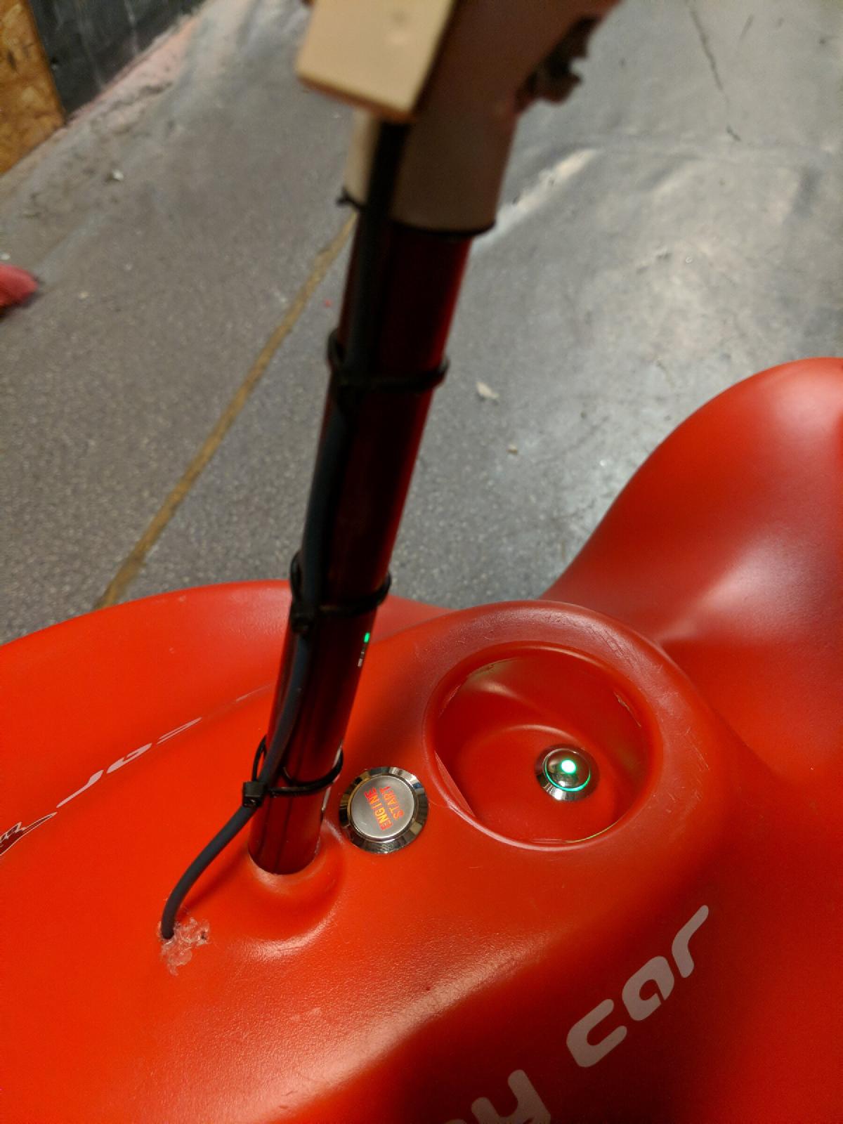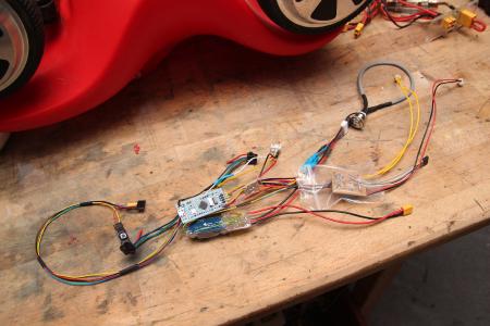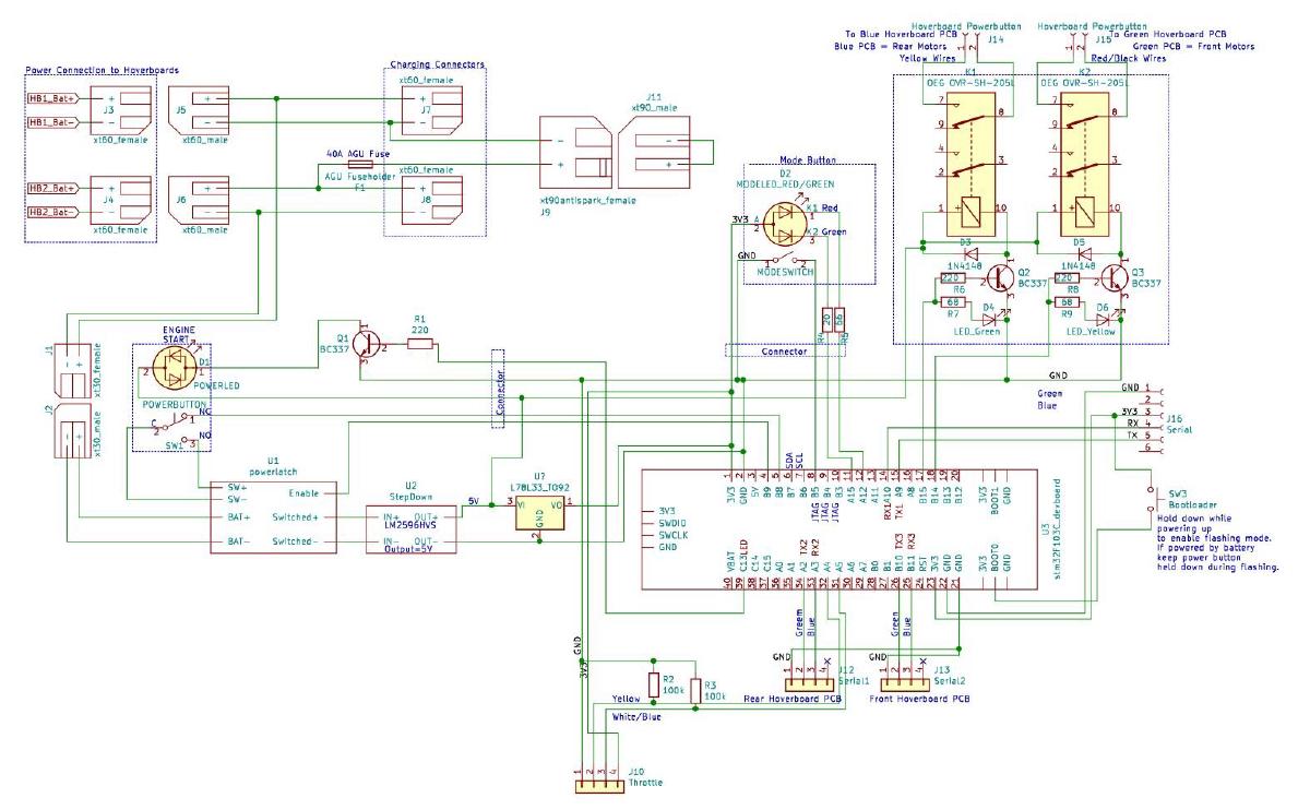 Der controller wird durch den neuen “Engine Start” Knopf hinter der Lenkstange eingeschaltet. Erneutes Drücken aktiviert zwei Relais, welche die Powerschalter der beiden Hoverboards simulieren. Das lässt sich vermutlich deutlich eleganter umsetzen, jedoch schien das mir der Problemfreieste Weg. Und es klickert ganz toll :) Die ursprünglichen Taster sind weiterhin parallel dazu angeschlossen für den Fehlerfall.