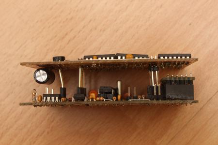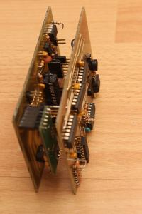Zuerst kommt das MinimOSD auf die dafür vorgesehenen Buchsenleisten auf der Digitalplatine, danach wird die kleine Soundplatine mit ihren drei Pins eingesteckt (auf den beiden andern Bilder noch nicht abgebildet). Obendrauf kommt dann die Analogplatine. Das ganze Passt perfekt in ein Kunststoffgehäuse. (LxBxH): 135x75x49 mm
