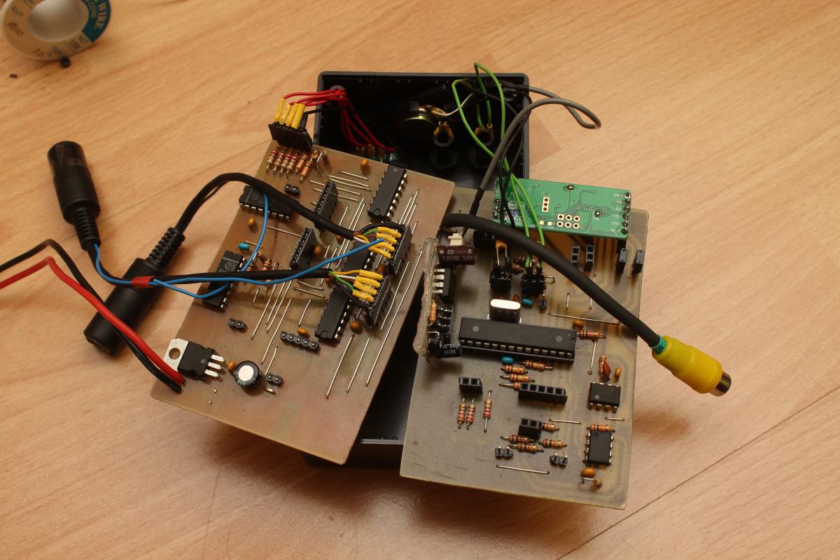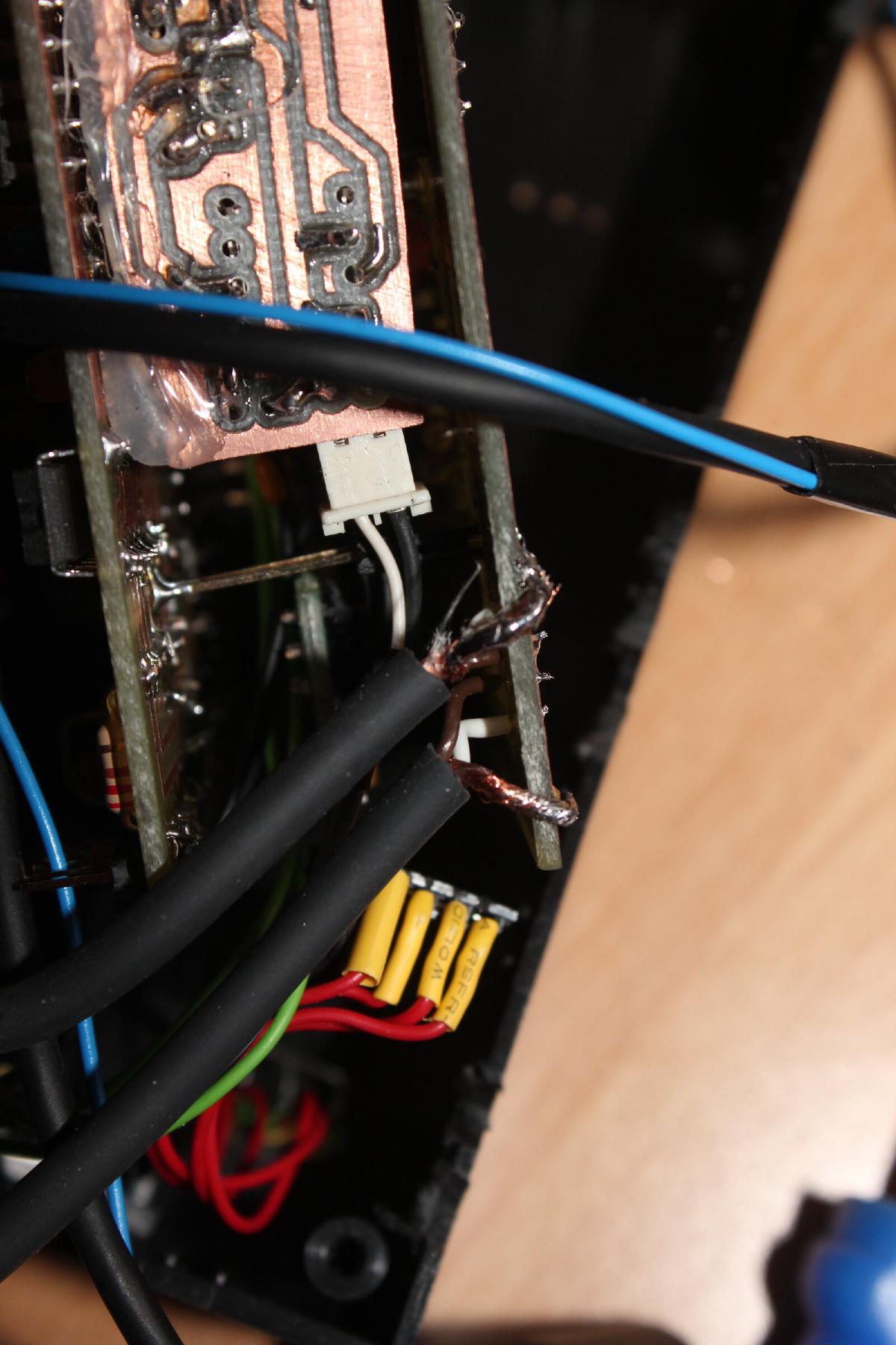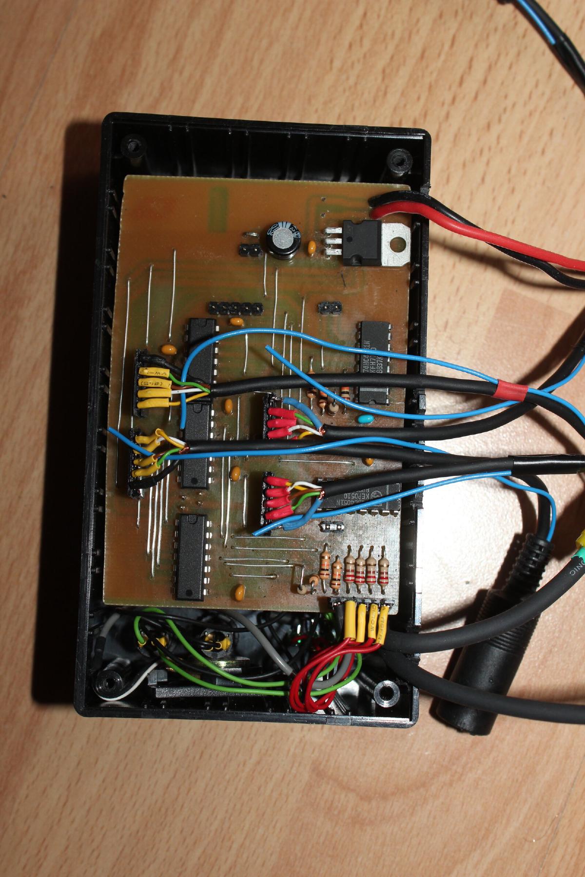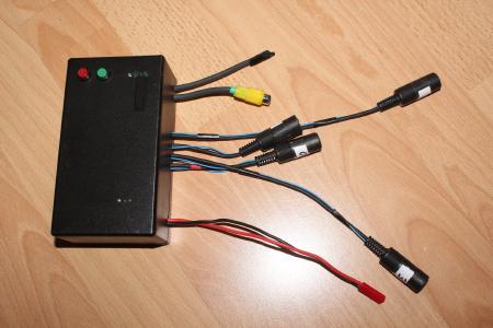 Stromkabel sowie Video- und Audioausgang hab ich direkt auf die Platine gelötet. Die Empfänger werden je über einen 6-Poligen MiniDIN Stecker angeschlossen. Jede MiniDIN Buchse ist mit einem kurzen Kabel mittels Buchsenleiste auf die obere Platine gesteckt und wird durch herausgefeilte Schlitze zwischen Gehäuse und Deckel herausgeführt.