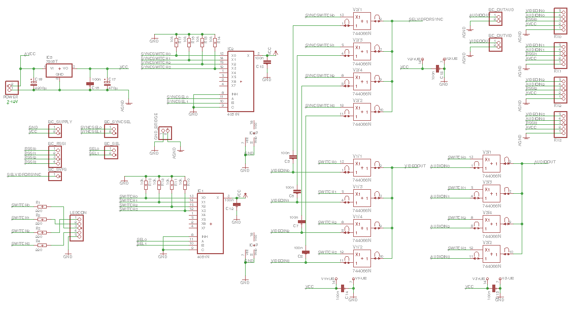 Ganz rechts im Schaltplan zu sehen: alle vier Anschlüsse für die Empfänger mit je Analoger Masse AGND , Versorgungsspannung AVCC , RSSI, Audio und Video. Die Boscam RC305 müssen für dieses Diversity den RSSI mit ausgeben, siehe RC305 RSSI.