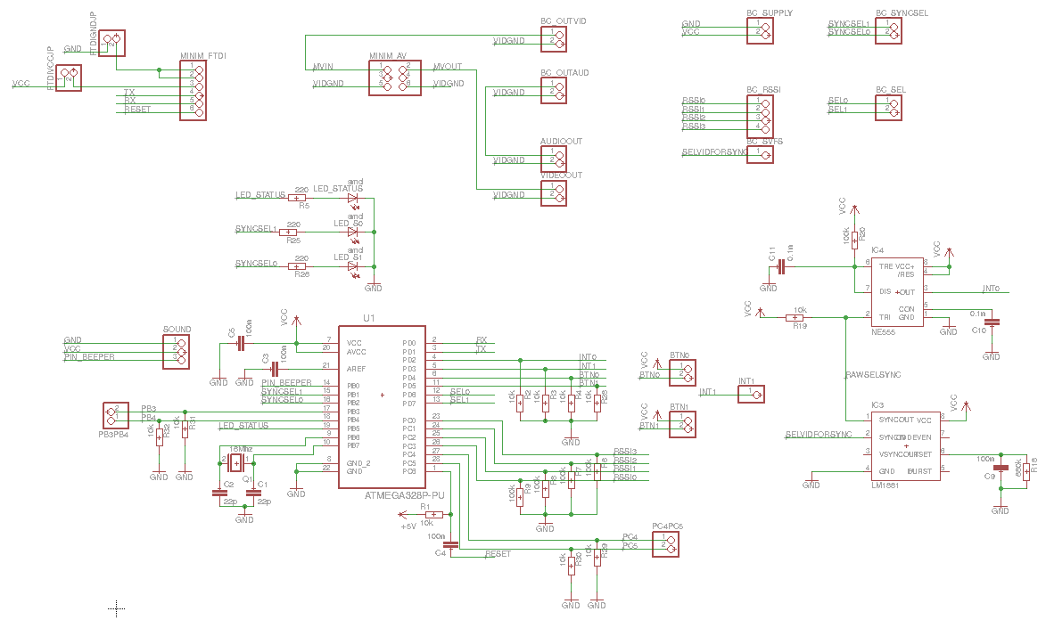 Folgender Screenshot zeigt den Digitalteil (vom 18.3.2015). Viel ist eigendlich nicht drauf: unten links der Atmega328P mit seiner Standartbeschaltung und entsprechenden Ein-und Ausgängen. PIN_BEEPER (PB0) ist der Soundausgang und geht zum Verstärker, welcher sich auf einem kleinen Addonboard befinden wird (siehe weiter unten). SYNCSEL0 und 1 ist die binäre Auswahl des Videosignals für den Sync Counter. Die beiden SYNCSEL Signale werden direkt zur analogen Platine geleitet, mittels BC_SYNCSEL. Alle Stiftleisten/Buchsenleisten mit dem Präfix BC (Board Connector) bedeuten eine Platinenverbindung von einem zum anderen Board. Die BC Verbindungen befinden sich auf beiden Platinen an den gleichen Stellen, sodass die obere mittels langen Stiftleisten auf die untere Platine mit Buchsenleisten gesteckt wird.