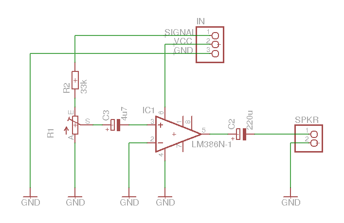 Für die Supermarktähnlichen Pieptöne sorgt eine kleine Addonplatine mit einem LM386 Audioverstärker. R1 ist ein Poti zum Einstellen der Lautstärke. Der Rest ist eigendlich selbsterklärend.