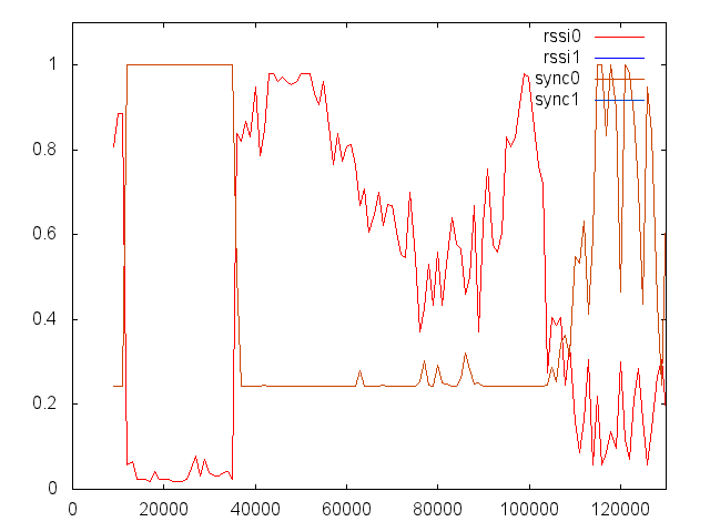 Zwischen 12000 und 35000 (Zeiteinheiten, x-Achse) ist der Sender ausgeschaltet, es werden aufgrund des Rauschens mehr als 65535 Syncs (Maximum für unsigned 16 Bit Integer) gezählt. Der RSSI Wert ist wie zu erwarten nahe des Minimums.