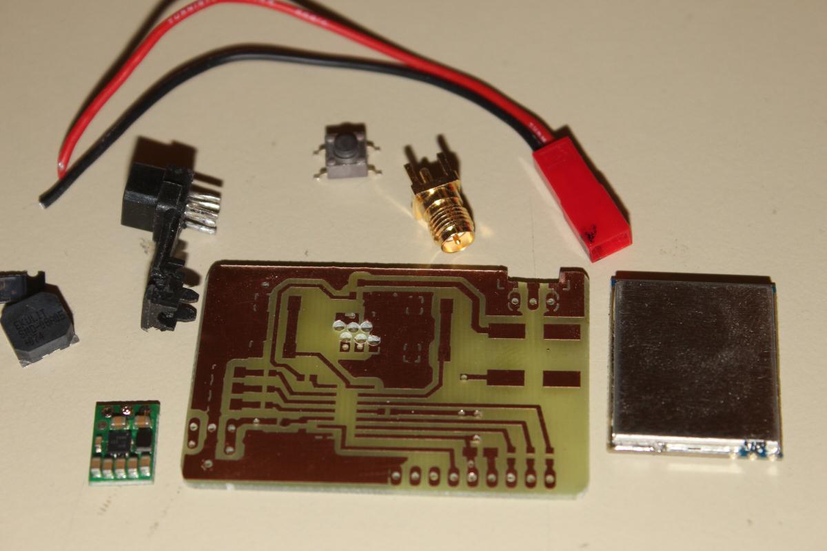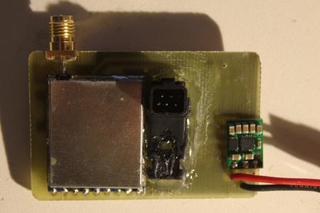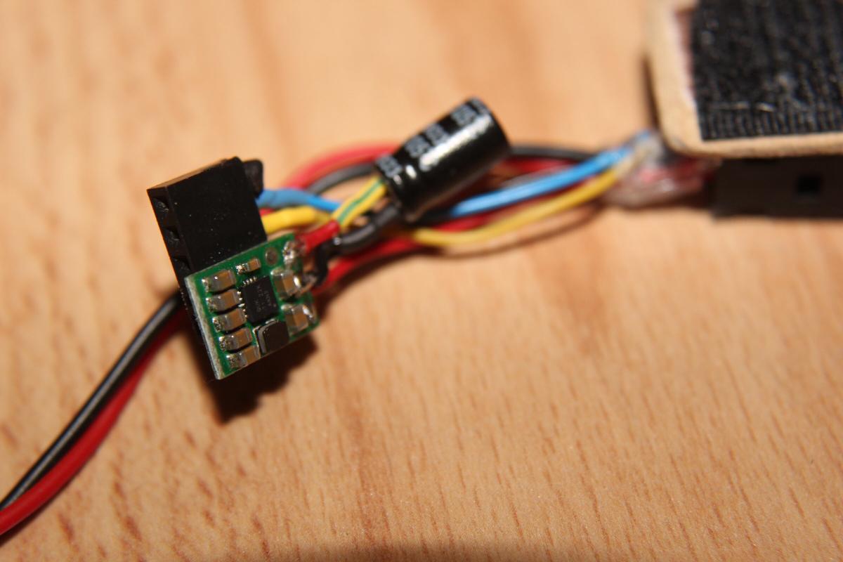 Die Platine wird nachher direkt an den Futaba Stecker geklebt und hält so an der Brille fest. Ein Pololu 5V Stepdown versorgt den ATTiny und das Modul. Die Spannung für die Brille wird direkt vom 2S Lipo durchgegeben. Auch dabei, ein Buzzer.