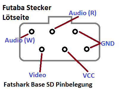 Audio (Weiss), Audio (Rot), Video sowie Masse und VCC (bei der Fatshark am besten so 7V).