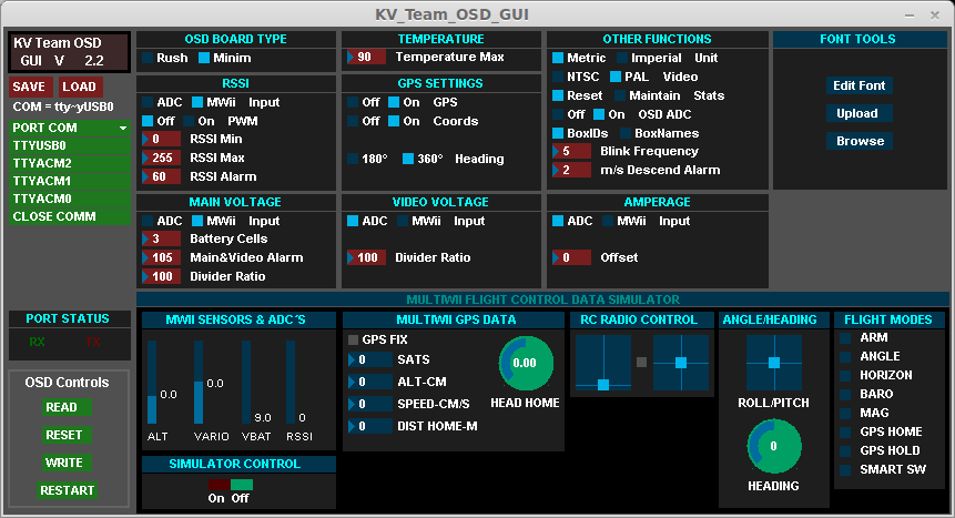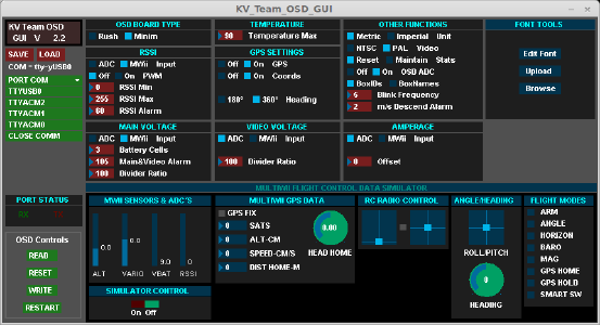 Per Arduino IDE musste ich die KV-Team Firmware flashen und danach per “KV Team OSD GUI” die im data Ordner liegende Charactermap “MW_OSD_Team.mcm” draufladen (oben rechts unter “Font Tools” mit Browse auswaehlen und mit Upload auf das Minim laden), da sonst einige Symbole falsch angezeigt wurden.