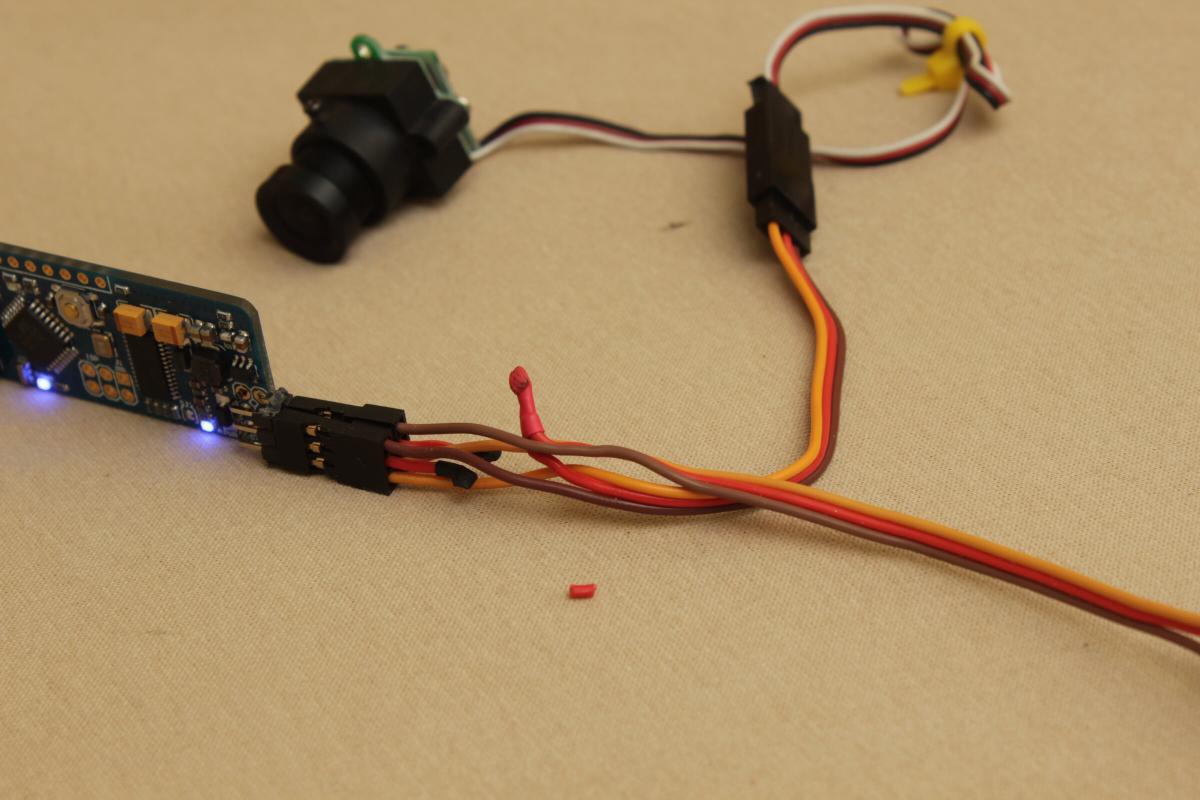Da das Minim wohl Probleme macht (besser gesagt kaputt geht), wenn es 12V abbekommt, hab ich ein Adapterkabel gelötet. Das mittlere Kabel der beiden Servokabel hab ich jeweils gekappt und direkt verbunden. Somit bekommt die Kamera ihre 12V vom Videosender. Die beiden 12V Pins am Minim bekommen keine Spannung zu Gesicht.