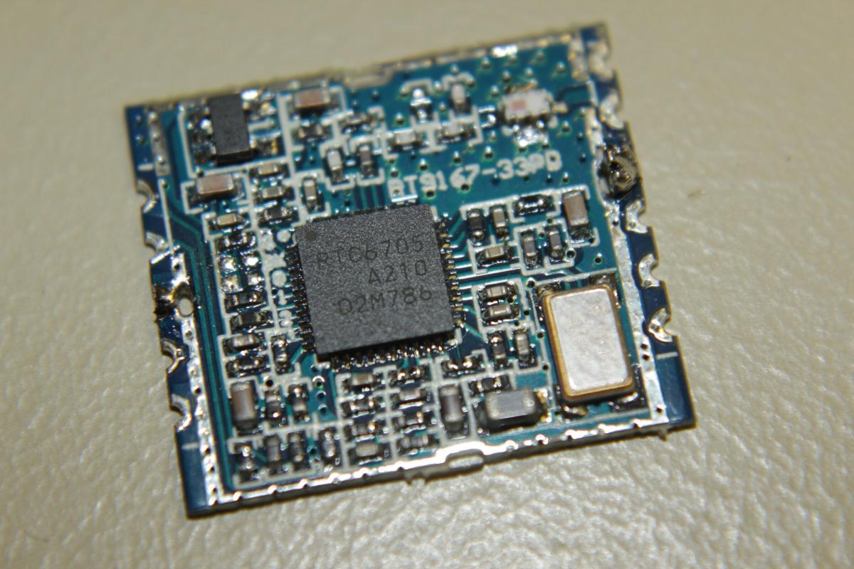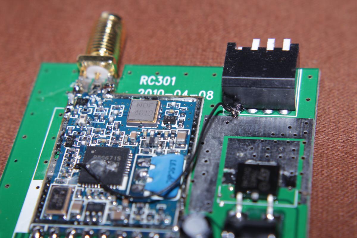 Der eigendliche Receiver befindet sich auf der kleinen blauen Platine in der Mitte. Um an den eigendlichen Chip zu kommen, muss die Schirmung abgelötet werden. Mit etwas Ablötlitze ist das aber gut machbar.