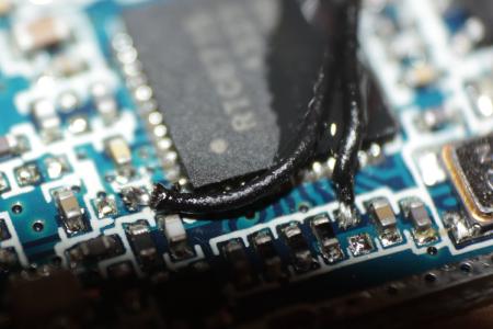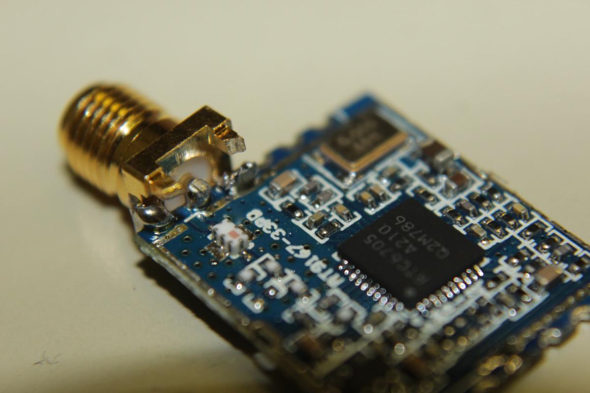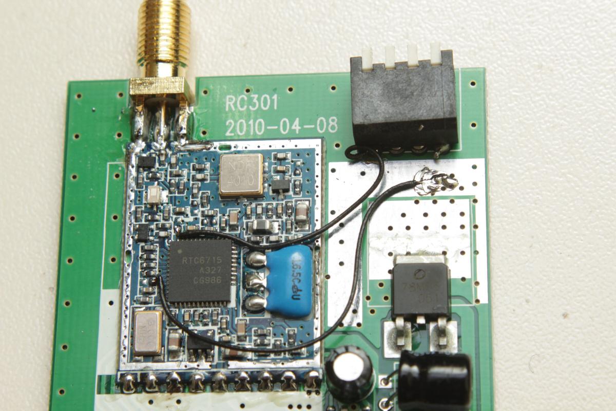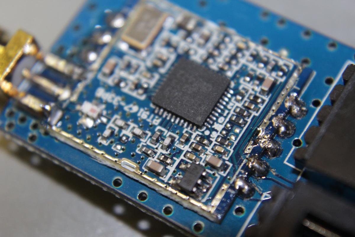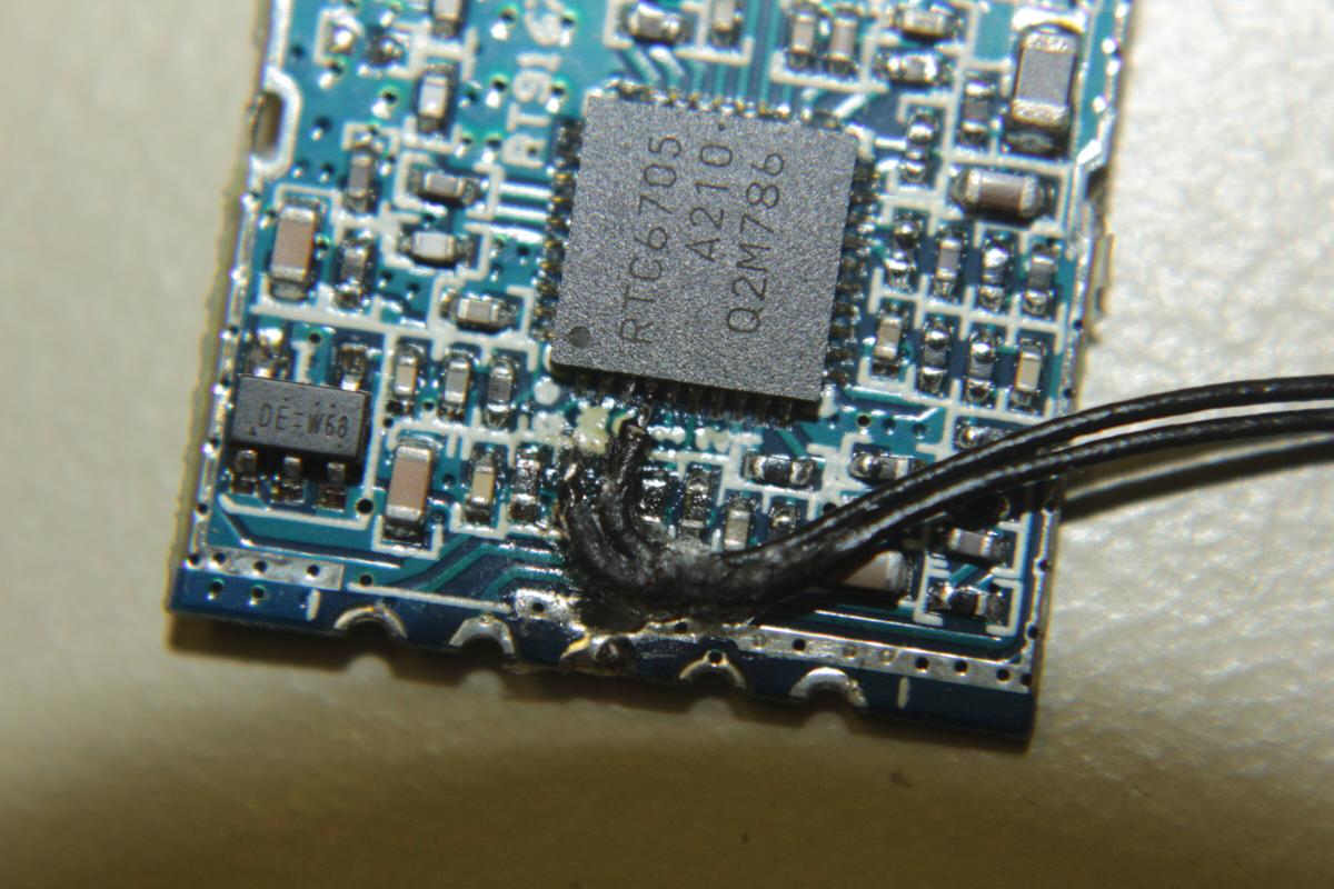Der 200mW Sender war weniger schwierig. Kurz Pins durchzählen, Leitbahn nachverfolgen und kleinen Draht drüberlöten.