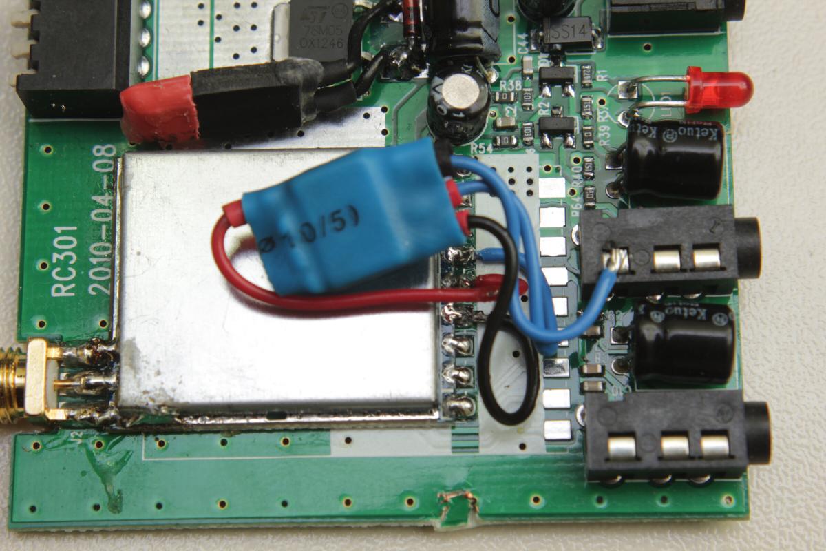 Da ich es nervig fand ein extra Anschluss am Gehäse anzubringen hab ich das RSSI Signal auf eine der 4 Poligen AV-Out Buchsen gelegt. Der RC305 kann eh nur Mono wesshalb der 4. Pin des AV-Out (also die Spitze des Steckers) überflüssig ist. Nachdem der kleine Kondensator (C9, Im Bild blau markiert) neben der 3.5mm Buchse abgelötet ist kann der Ausgang des RSSI-Puffers an die Buchse gelötet werden.