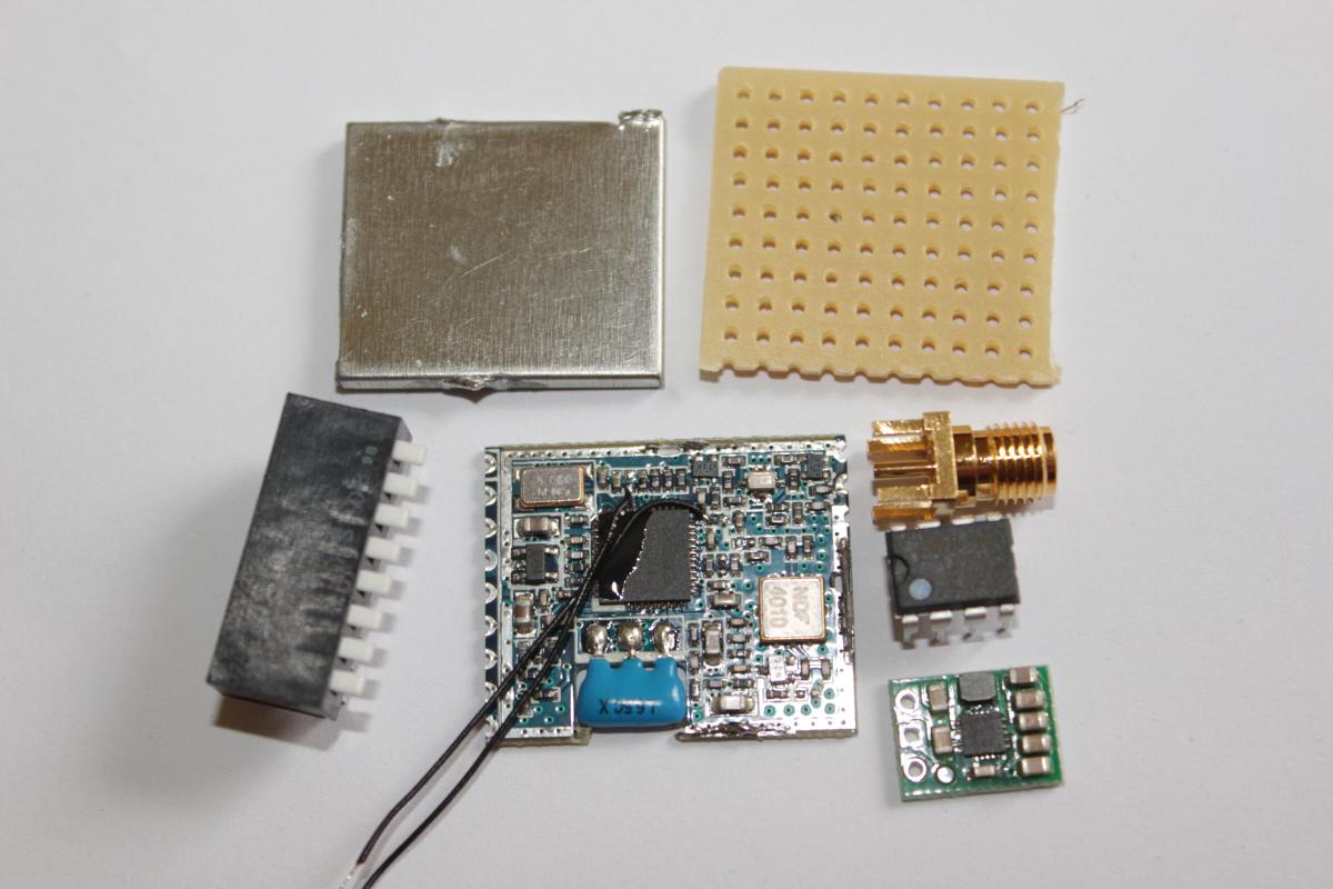 Hier noch ein paar Ingredienzien: wieder der überdimensionierte 8-Fach Dip (es werden wieder nur 5 davon benötigt), eine RP-SMA Buchse, ein Pololu 5V Stepup/Stepdown (D24V6F5) von Watterott, nen Lochrasterplatinenreststück und einen schnuckeligen LM358 für den RSSI Impedanzwandler (siehe weiter oben).