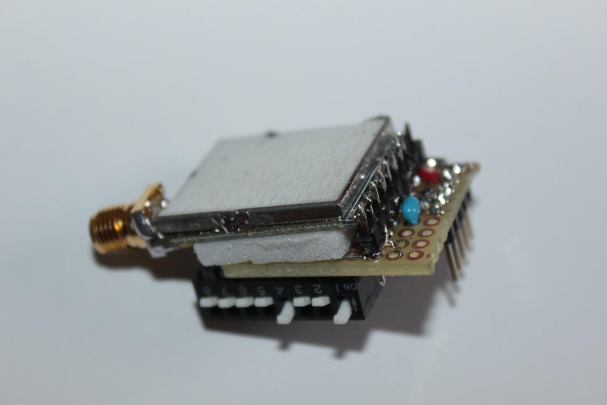 Nachdem das Metallblech wieder drauf war musste ich lediglich die beiden herausgeführten Kabel und die “Channelauswahlpins” Ch1,Ch2 und Ch3 an einen mindestens 5-Fach Dip Schalter löten. An die andere Seite der Dip-Schalterleiste kam dann noch Masse dran.