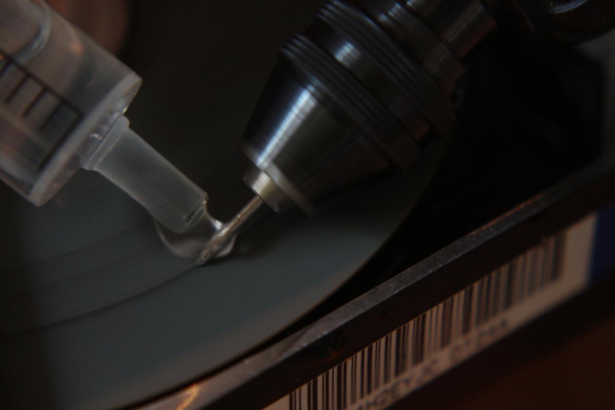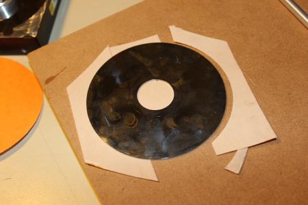 Um nun auf dem Plattenteller Metall schleifen zu können wird eine Scheibe herausgenommen und von einer Seite zuerst mit doppelseitigem Klebeband versehen. Überstehendes im Inneren, sowie außen wird mit einem scharfen Messer sauber abgeschnitten. Insgesammt sollte man beim Aufkleben so homogen wie möglich Arbeiten, da bei den 7000 Umdrehungen pro Minute die kleinste Unwucht schon negativ auffällt und der Schleifteller mit der Zeit wegläuft.