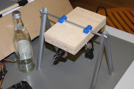 Damit die Nadeln nun auch damit geschliffen werden können musste eine neue Halterung her. Ein Zusammengeschweißter Winkel hällt seitlich eine alte Festplatte. Auf dem Festplattenmotor mit Lager ist eine Holzplatte befestigt, welche die Proxxon zum Schleifteller hin drehen kann. Das Gummiband sorgt für den entsprechenden Druck. Durch die Markierungen an der Halterung kann ich die Winkel nun etwas besser einschätzen.