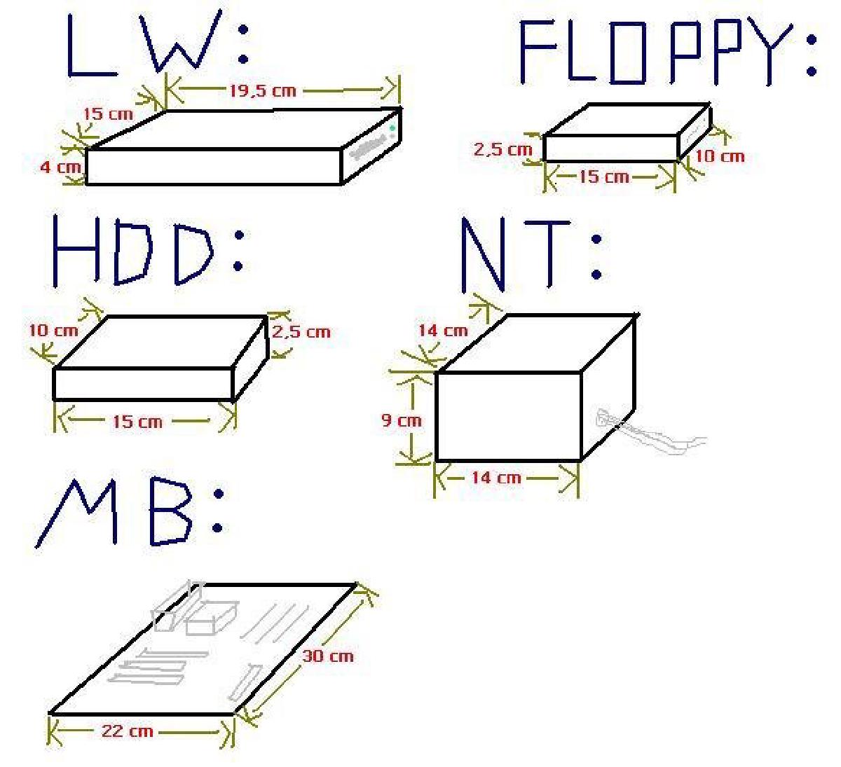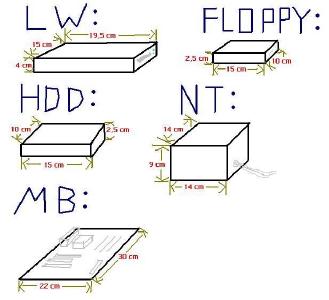 LW (CD/DVD Laufwerk): 15cm * 19,5cm * 4cm Floppy (Disketten Laufwerk): 10cm * 15cm * 2,5cm HDD (Festplatte): 10cm * 15cm * 2,5cm NT (Netzteil): 14cm * 14cm * 9cm MB (Mainboard/Motherboard): 30cm * 22cm * 12cm (Höhe bis PCI-Karten)
