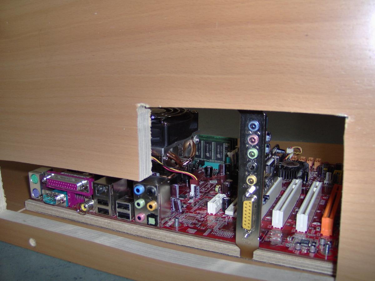 Auf der rechten Seite wird das Holz so Gesägt, dass das Mainboard