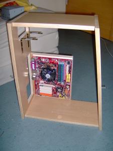 Den “Holz-Mainboardschlitten” am Holz festgeschraubt: